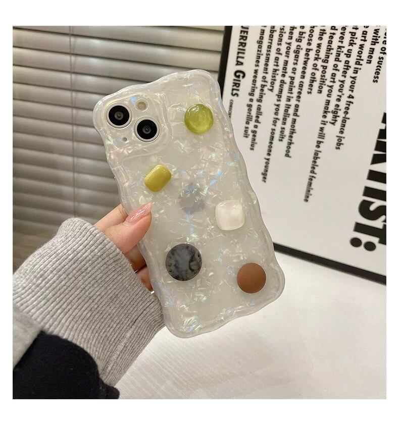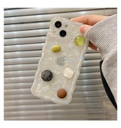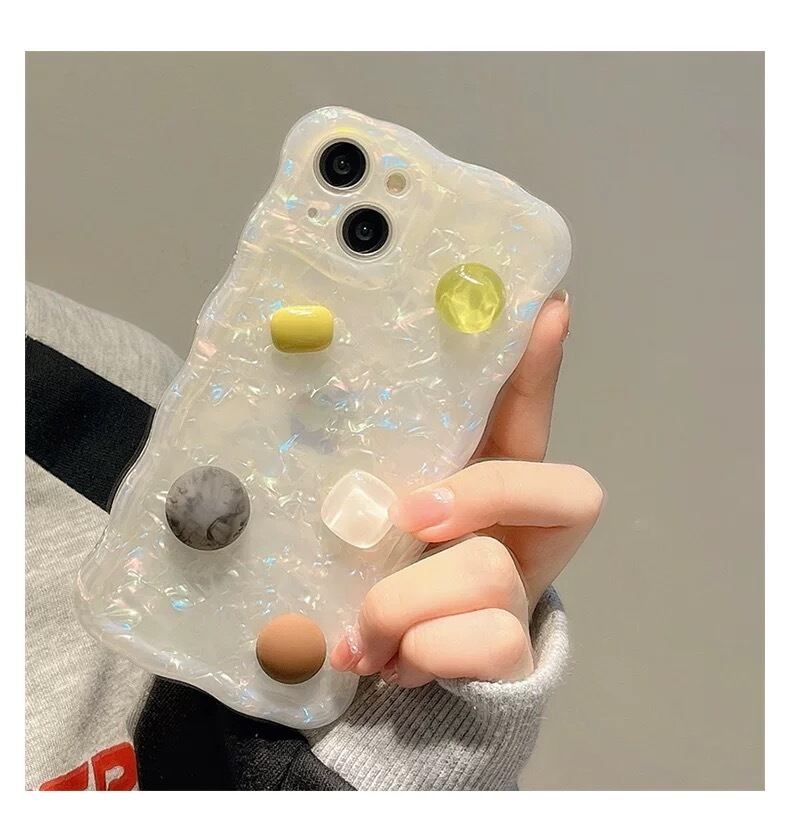ぷっくりとした立体ジェリービーンズ風パーツと、光の角度で表情を変えるオーロラマーブルの質感が可愛いスマホケースです。