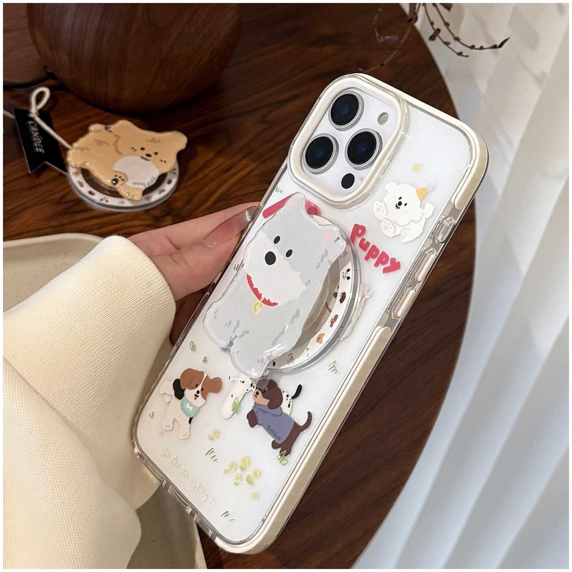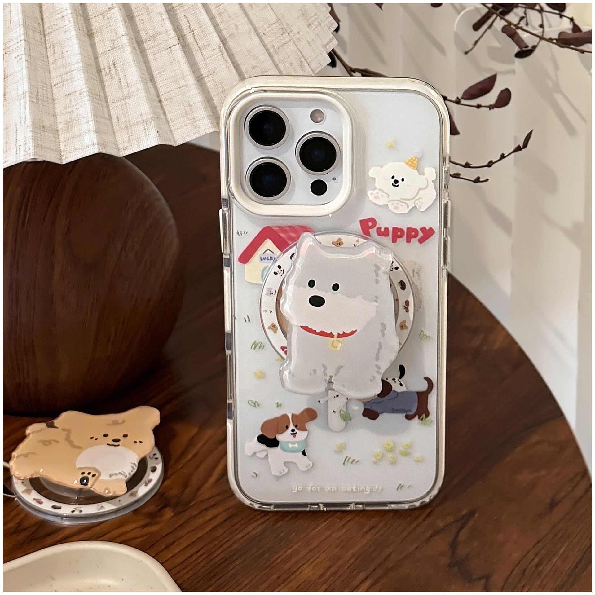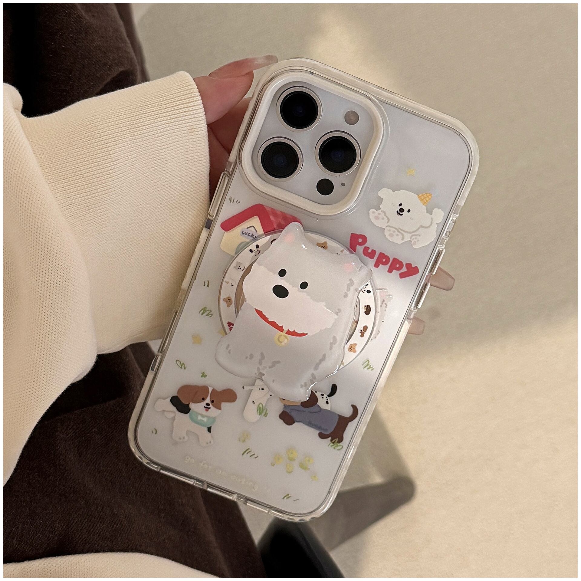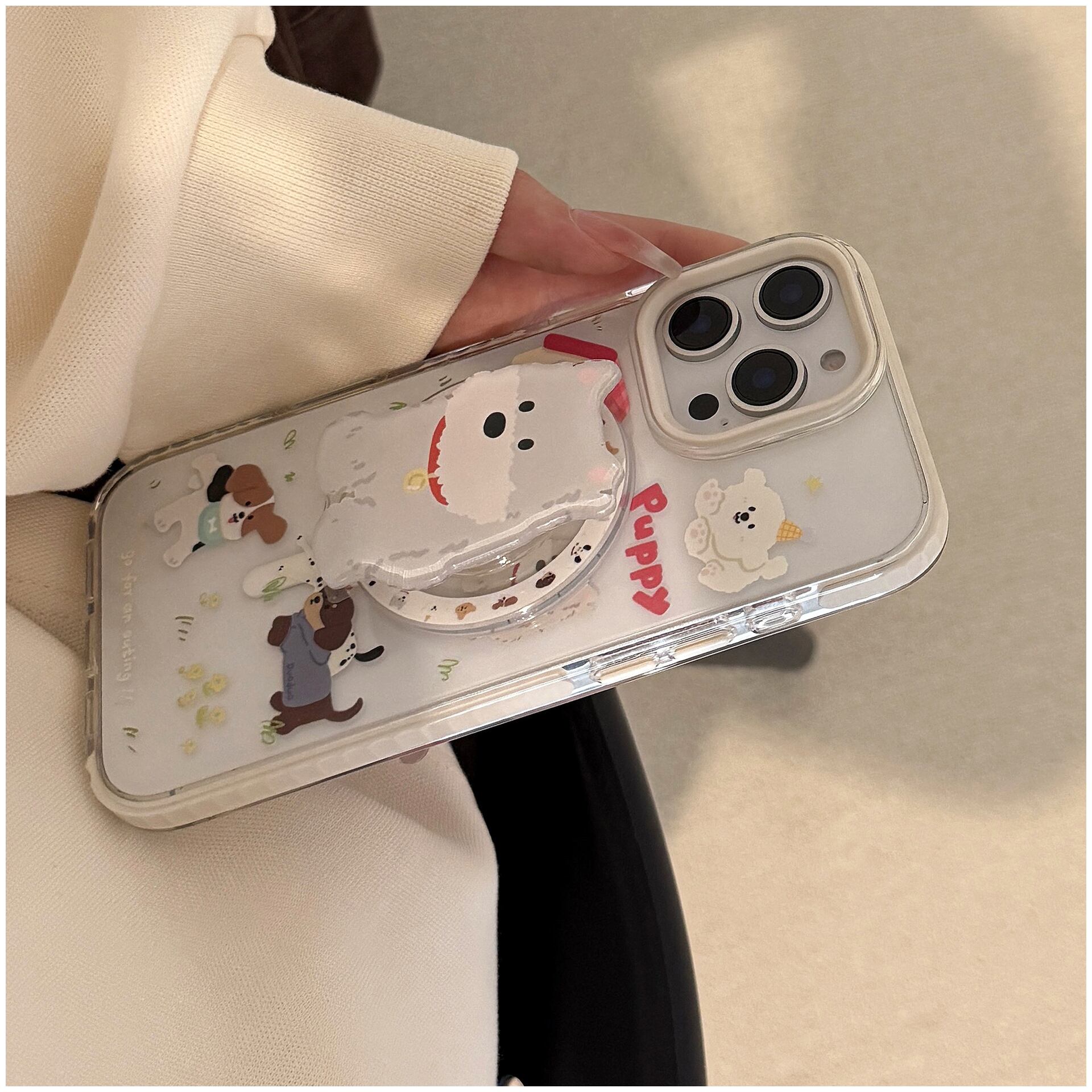 MagSafe対応 白縁油光仕上げ かわいい犬柄スマホケース|iPhone16/15/14/13/12/11対応|透明・子犬イラスト・磁気充電・人気プランプポップデザイン(単品販売) | Oct.life_STYLE