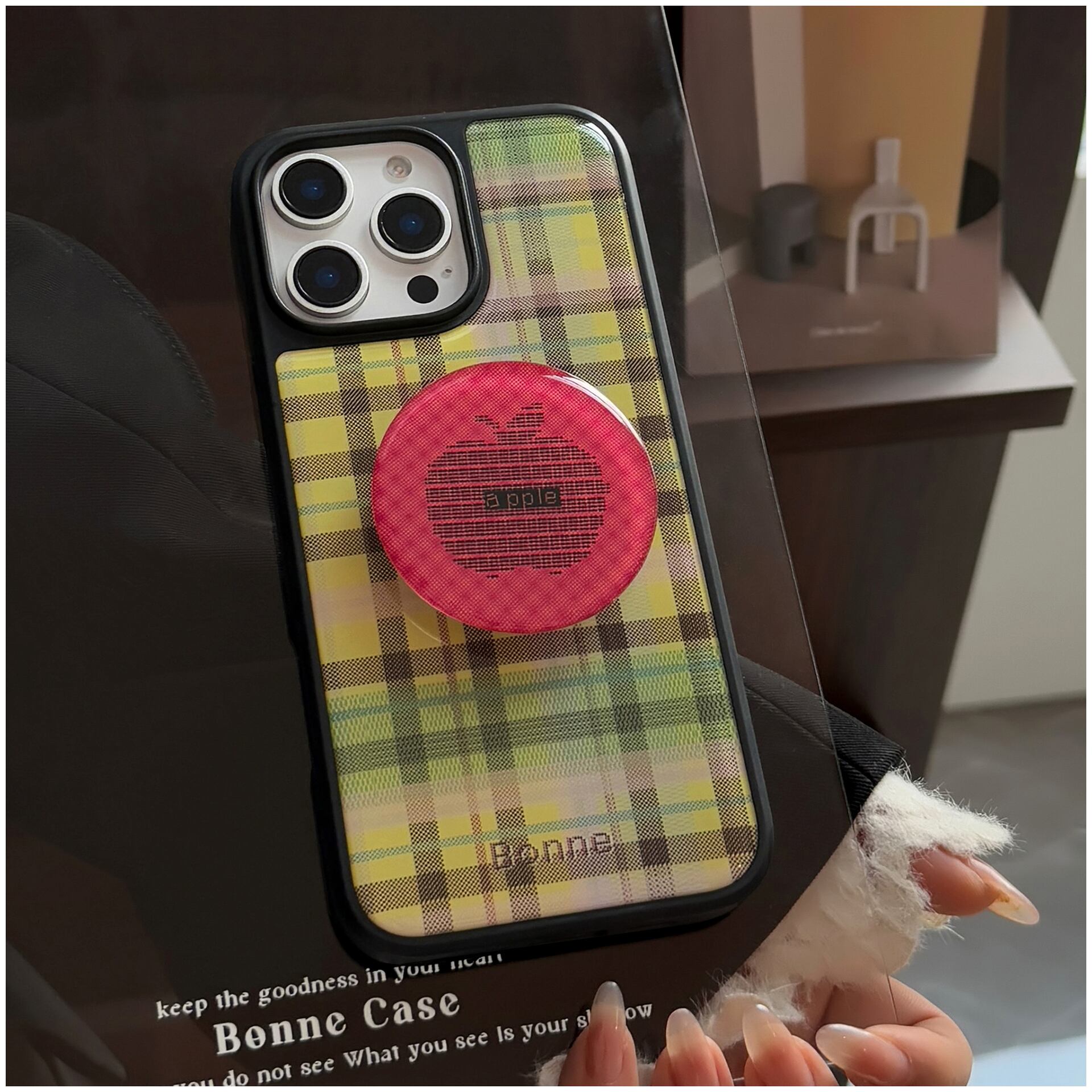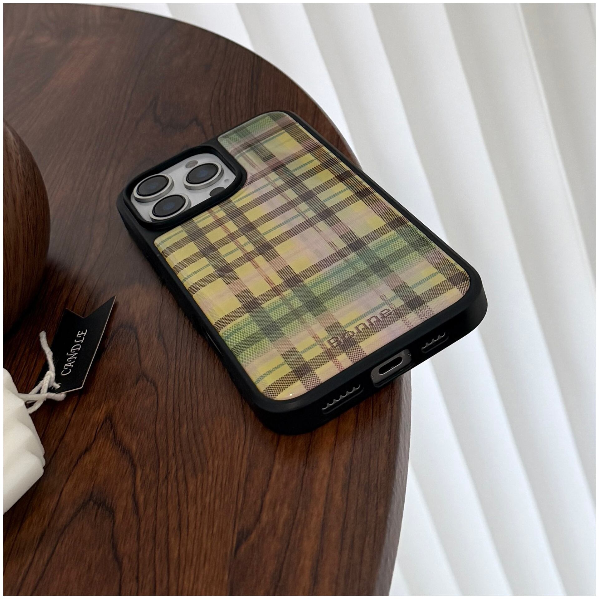 ヴィンテージ感のある黄色と緑系のチェック柄をベースにした、BonneデザインのiPhoneケースです。