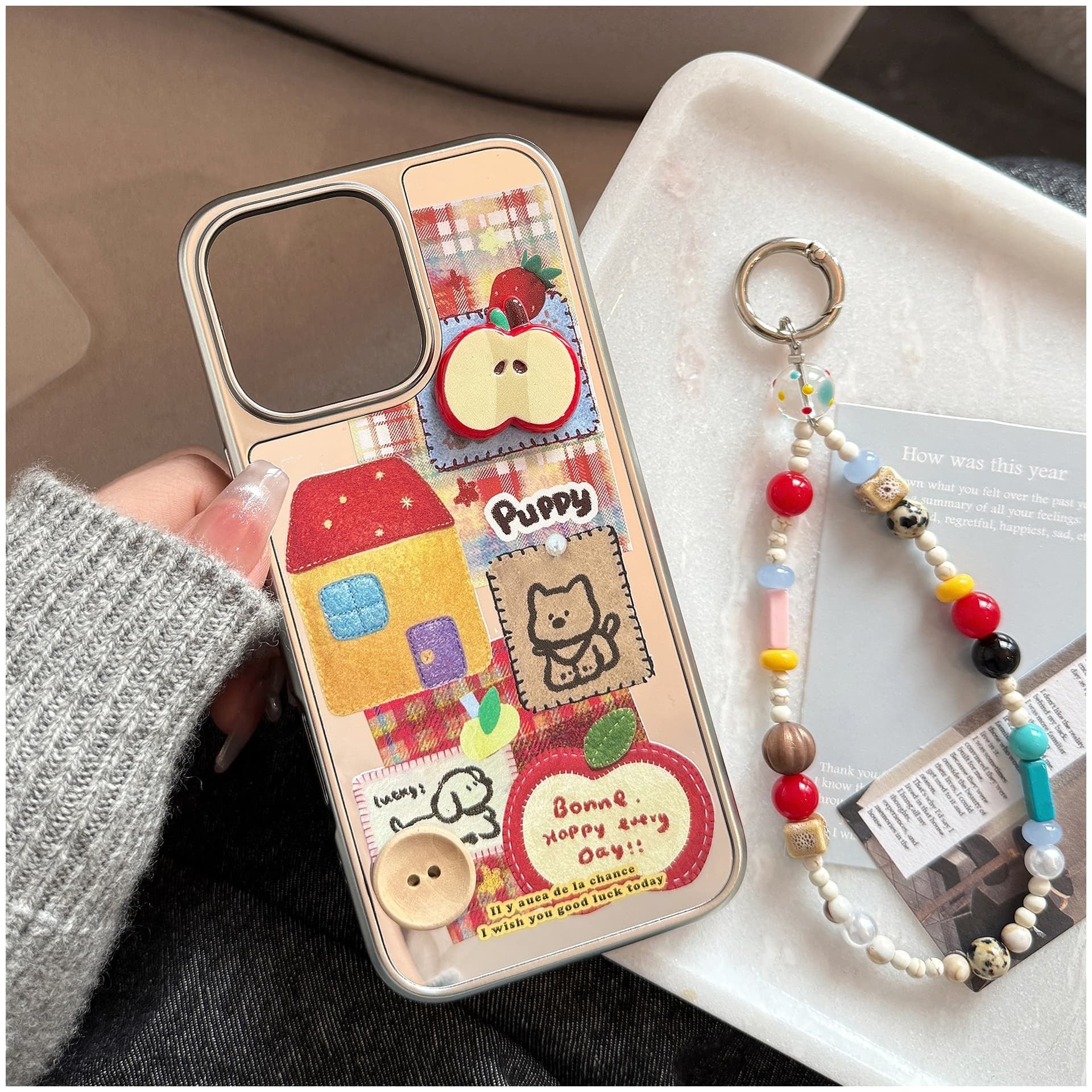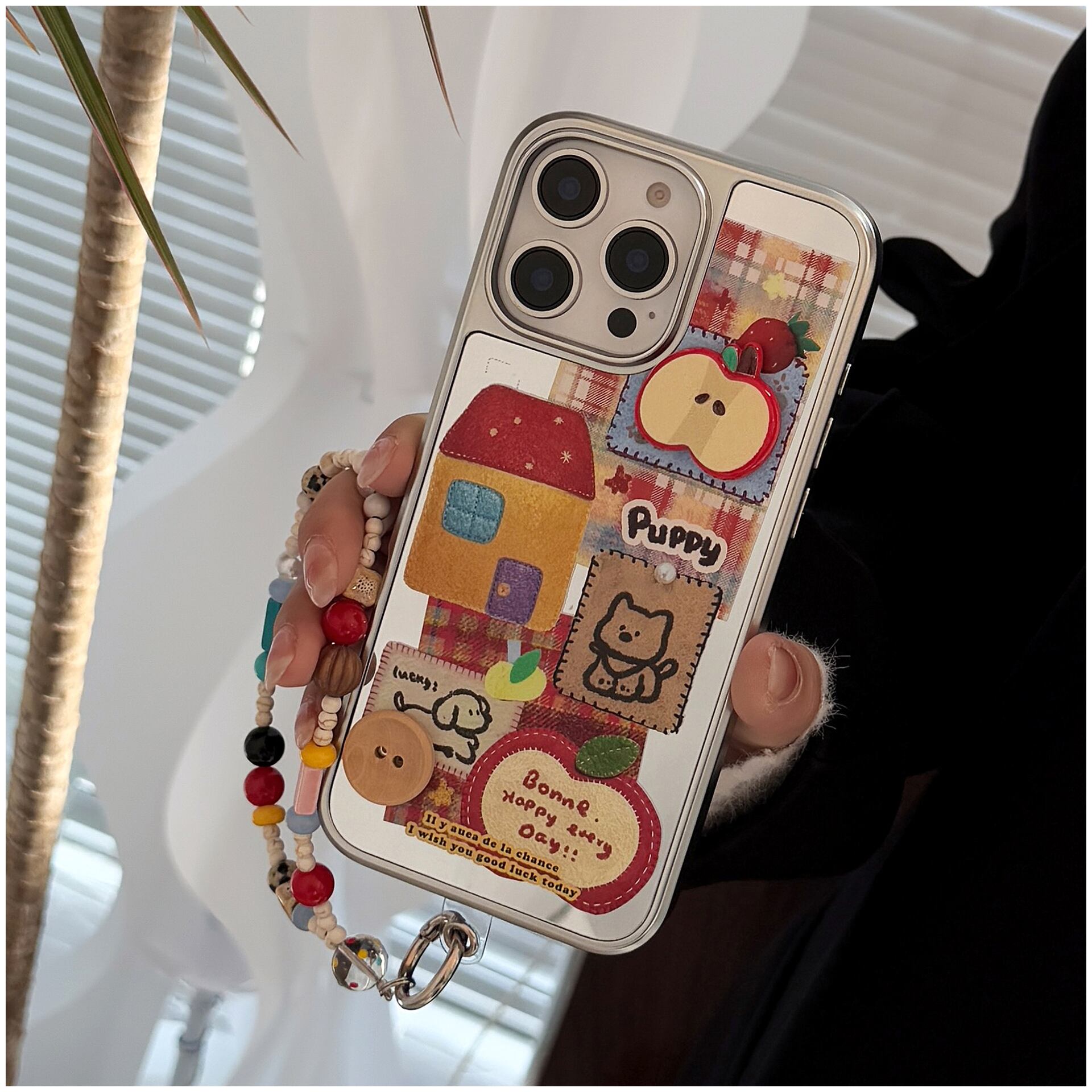 iPhoneケース 可愛いスマホケース 鏡面シルバー りんご 子犬 アップリケ風 デザイン個性派 ポップアート 韓国風ストリート iPhone16 iPhone15 iPhone14 iPhone13 iPhone12 iPhone11 ストラップ付き風ケース Bonne Happy Day ガーリー系デザイン プレゼントにも