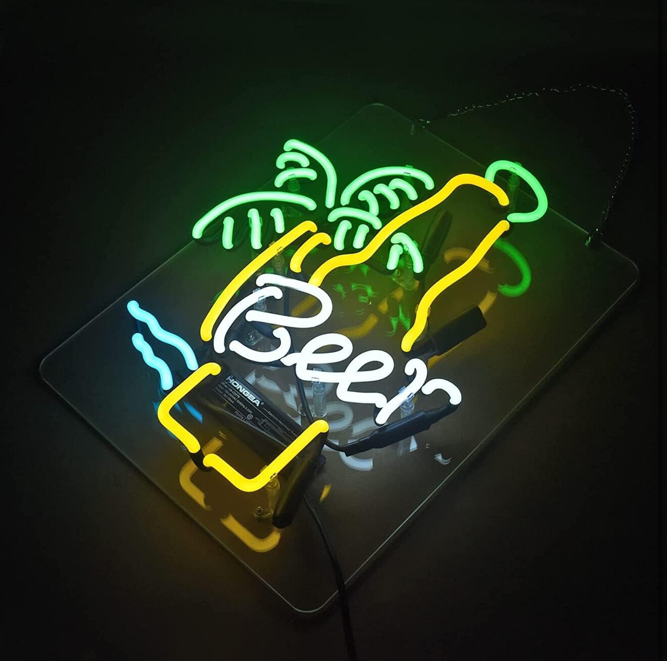 • デザイン:南国のヤシの木とビールボトルを組み合わせたリゾート感満載のネオンサイン。鮮やかなグリーン・イエロー・ブルー・ホワイトの発光が空間に遊び心と活気をプラスし、バー、カフェ、ビーチイベント、自宅インテリアなどにぴったりです。