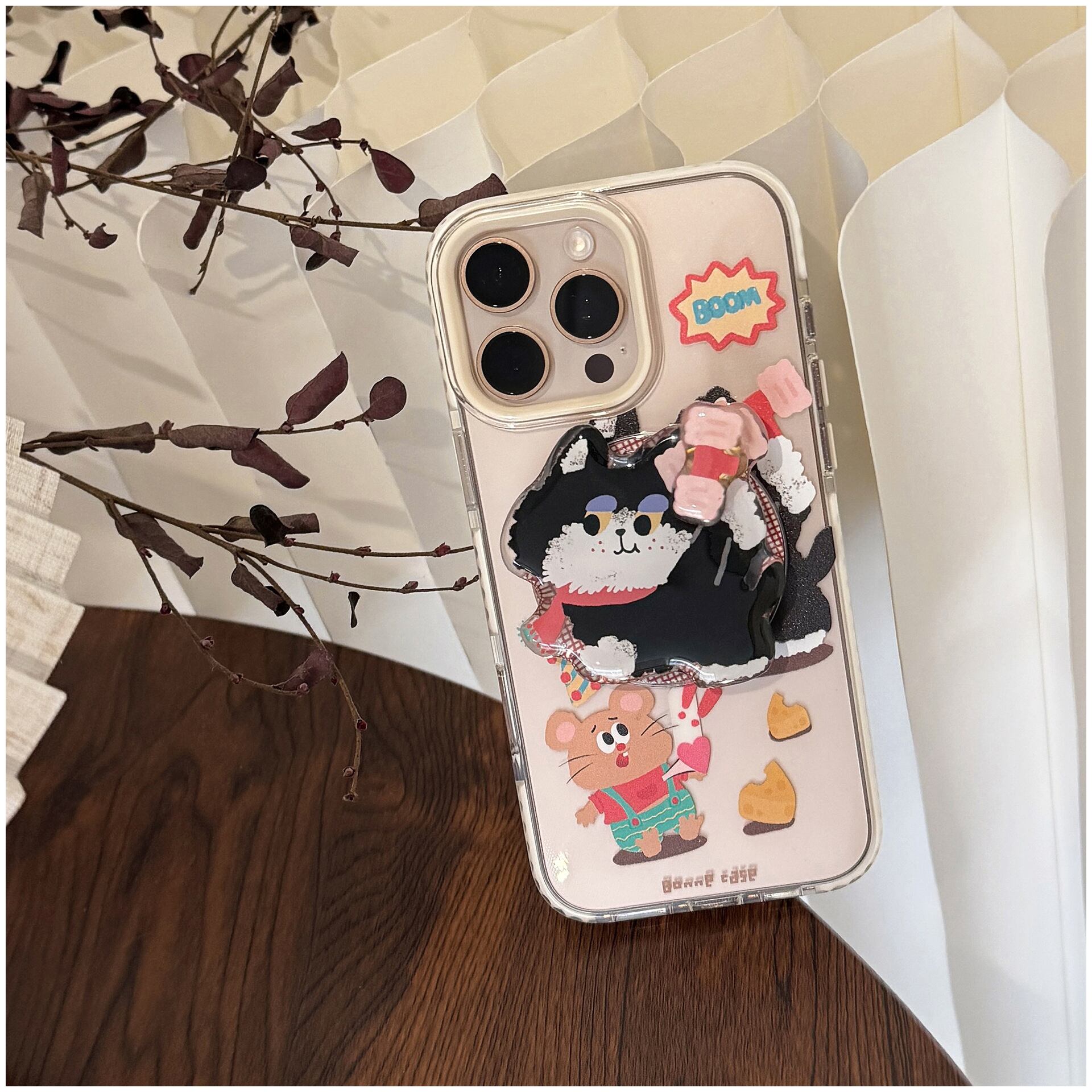 驚いたネズミと、棒で叩かれる猫という、個性豊かなキャラクターを立体アクリルで表現したインパクト抜群のスマホケースです。