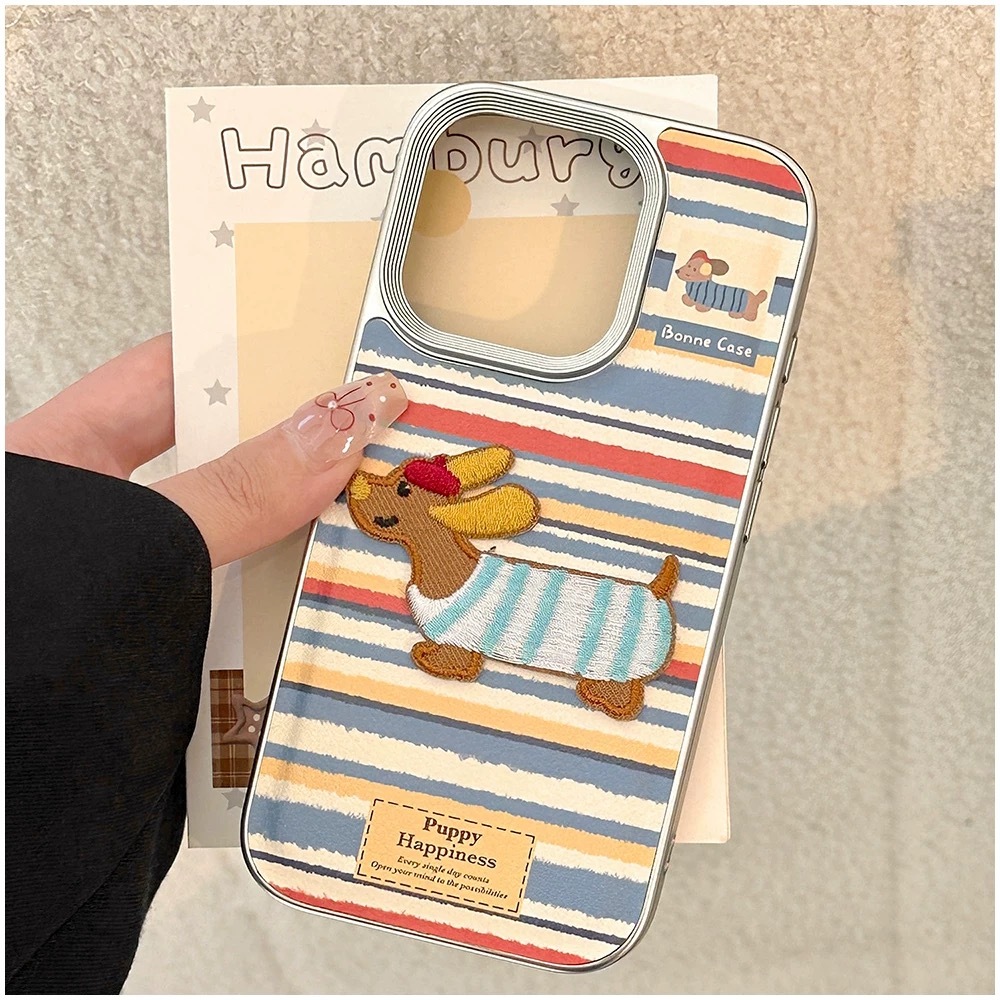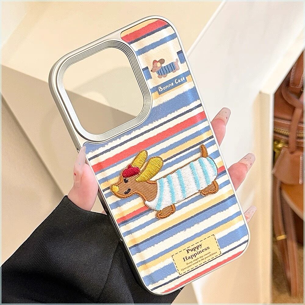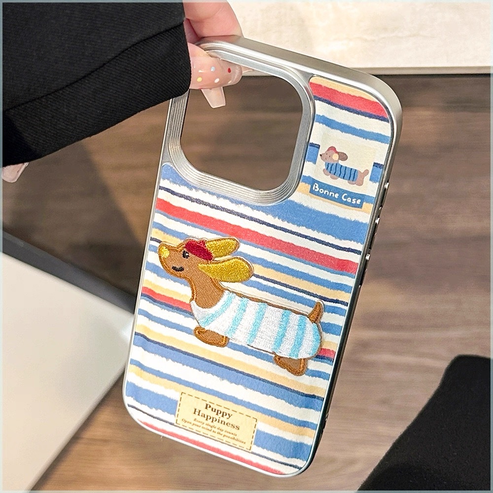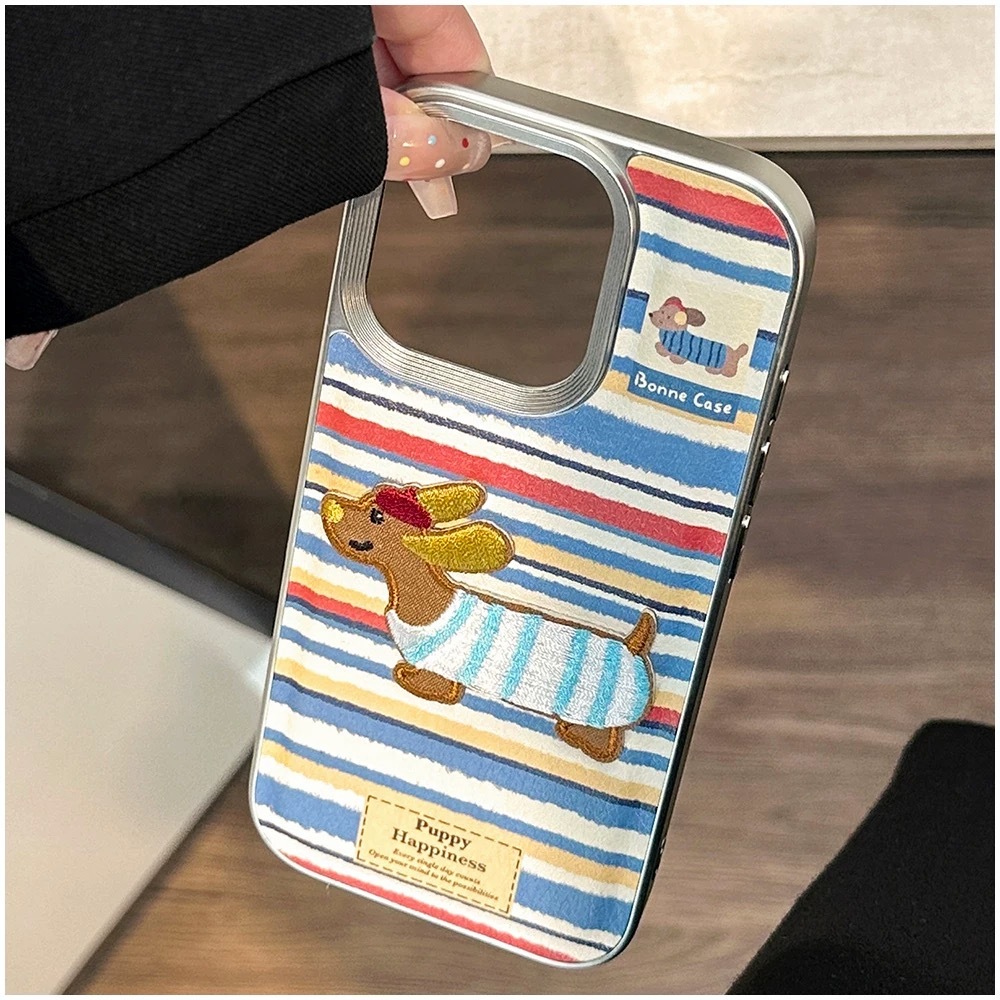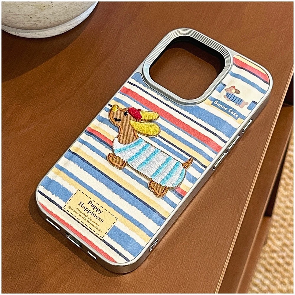 ブルー×レッド×ホワイトのボーダーストライプに、刺繍風の可愛いダックスフンド犬をあしらった、遊び心たっぷりのiPhoneケース。