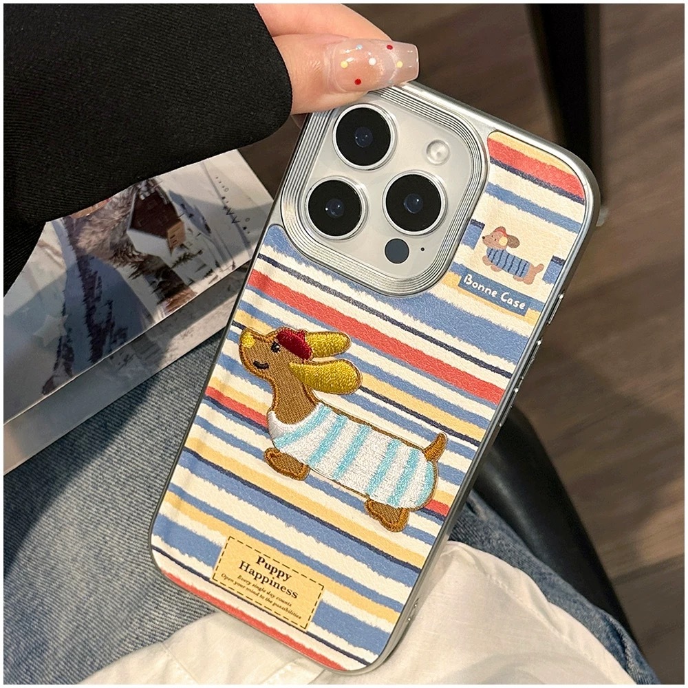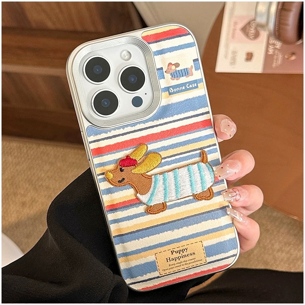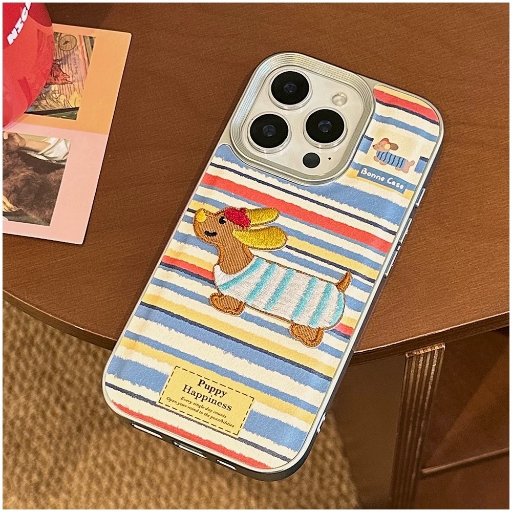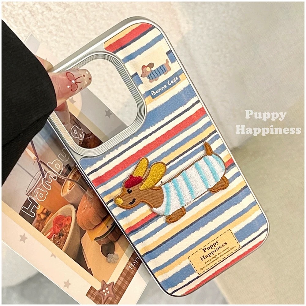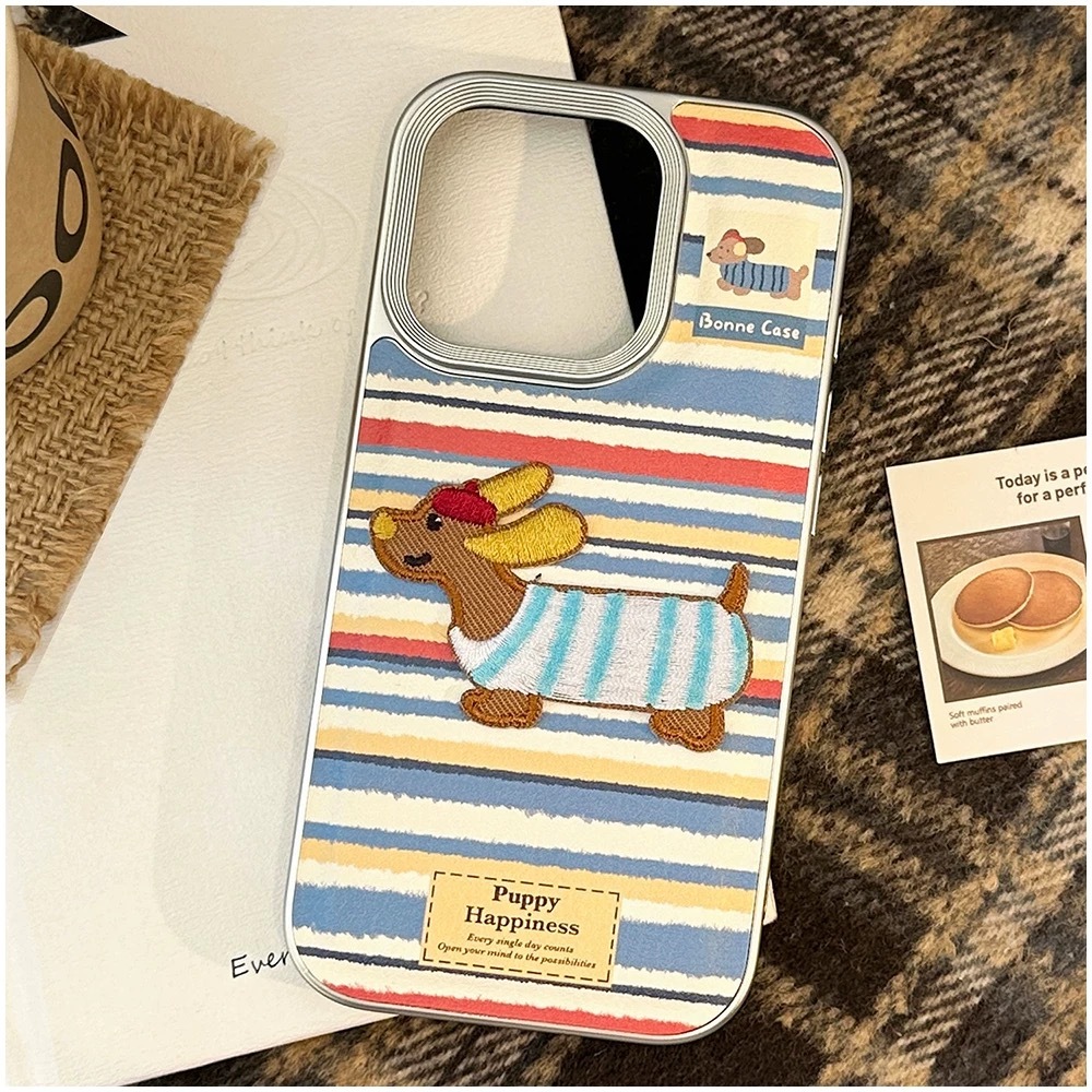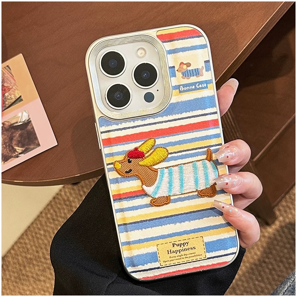 ブルー×レッド×ホワイトのボーダーストライプに、刺繍風の可愛いダックスフンド犬をあしらった、遊び心たっぷりのiPhoneケース。
