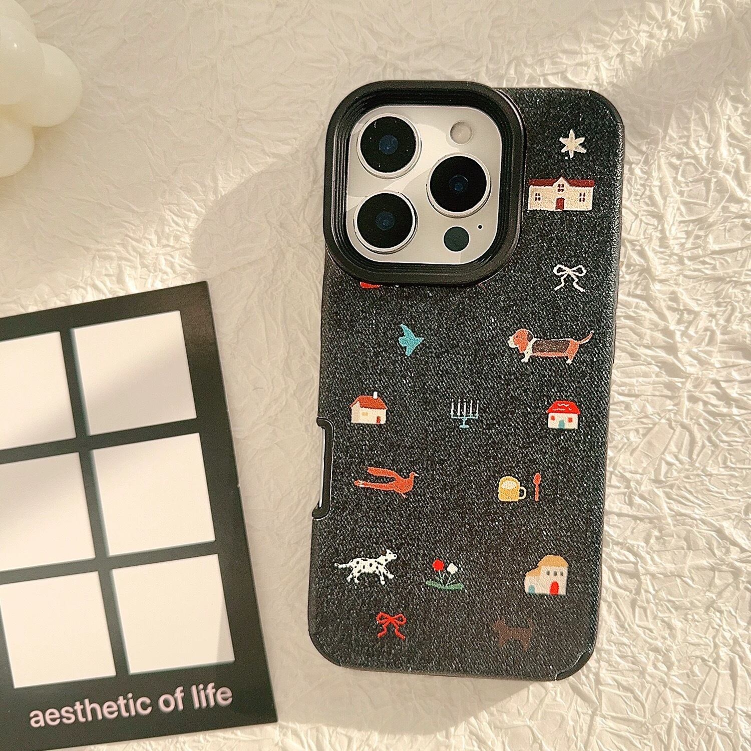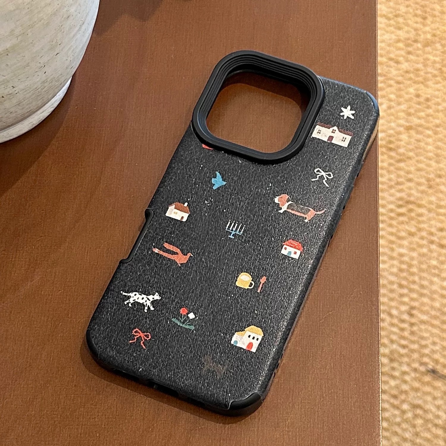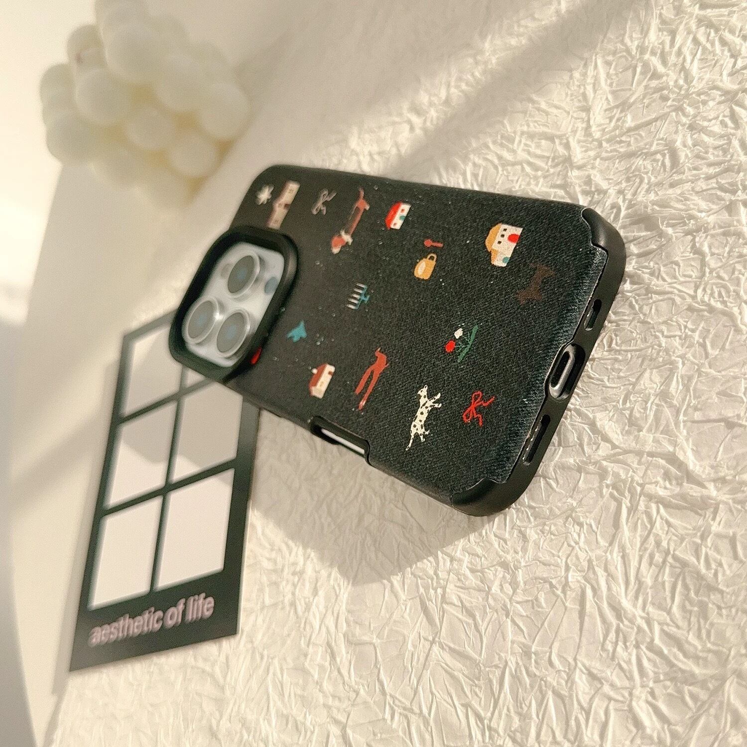 マットブラックベースに、犬・リボン・家・花・カトラリー・フォークなど、ミニマルながらユーモラスなモチーフが並ぶ、刺繍風プリントのソフトiPhoneケース。