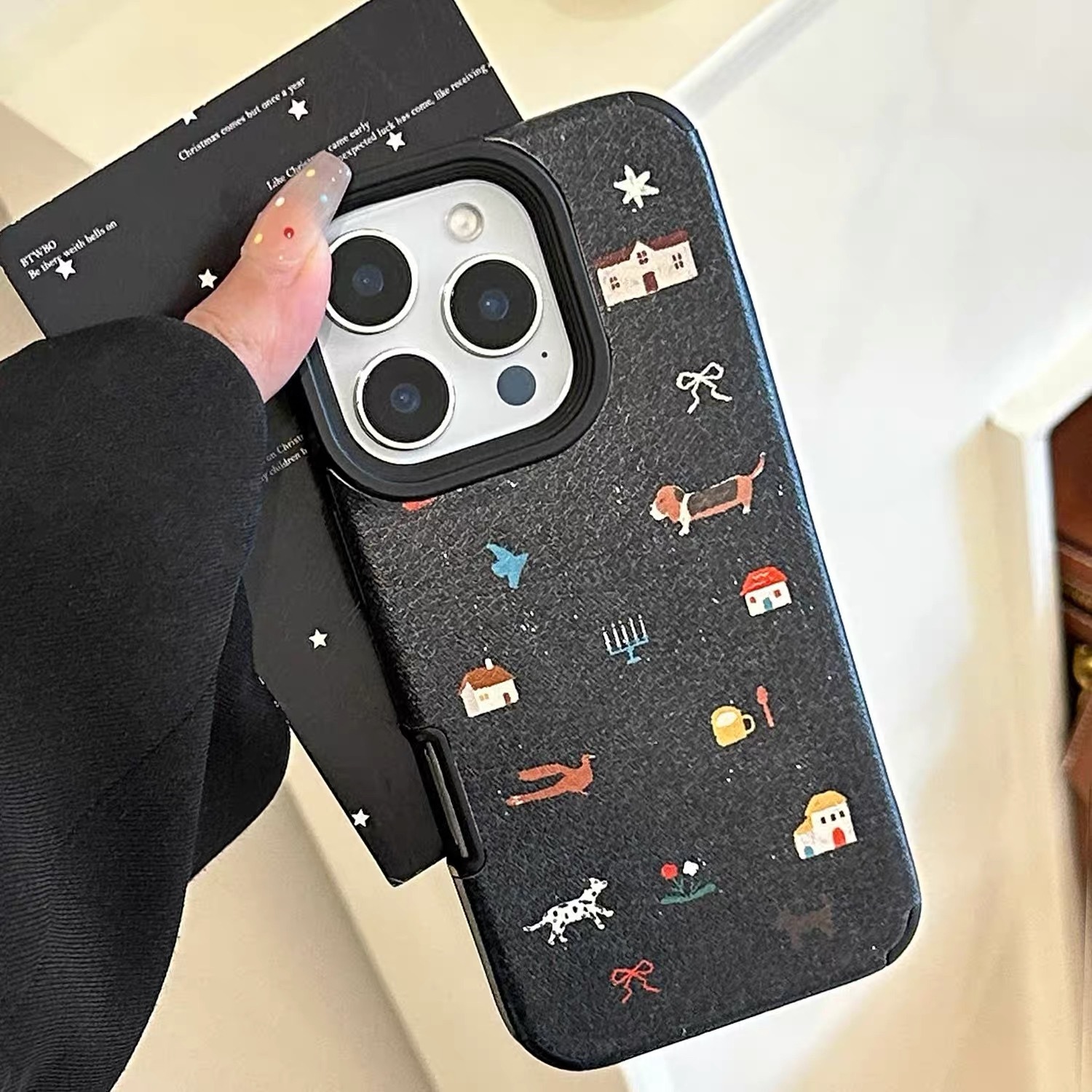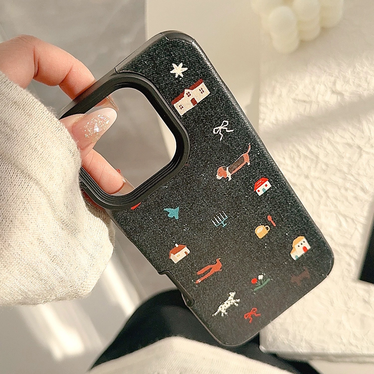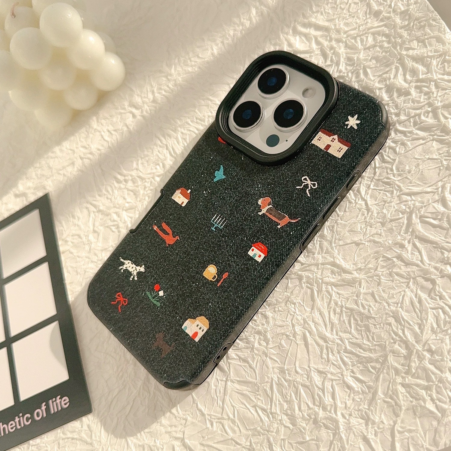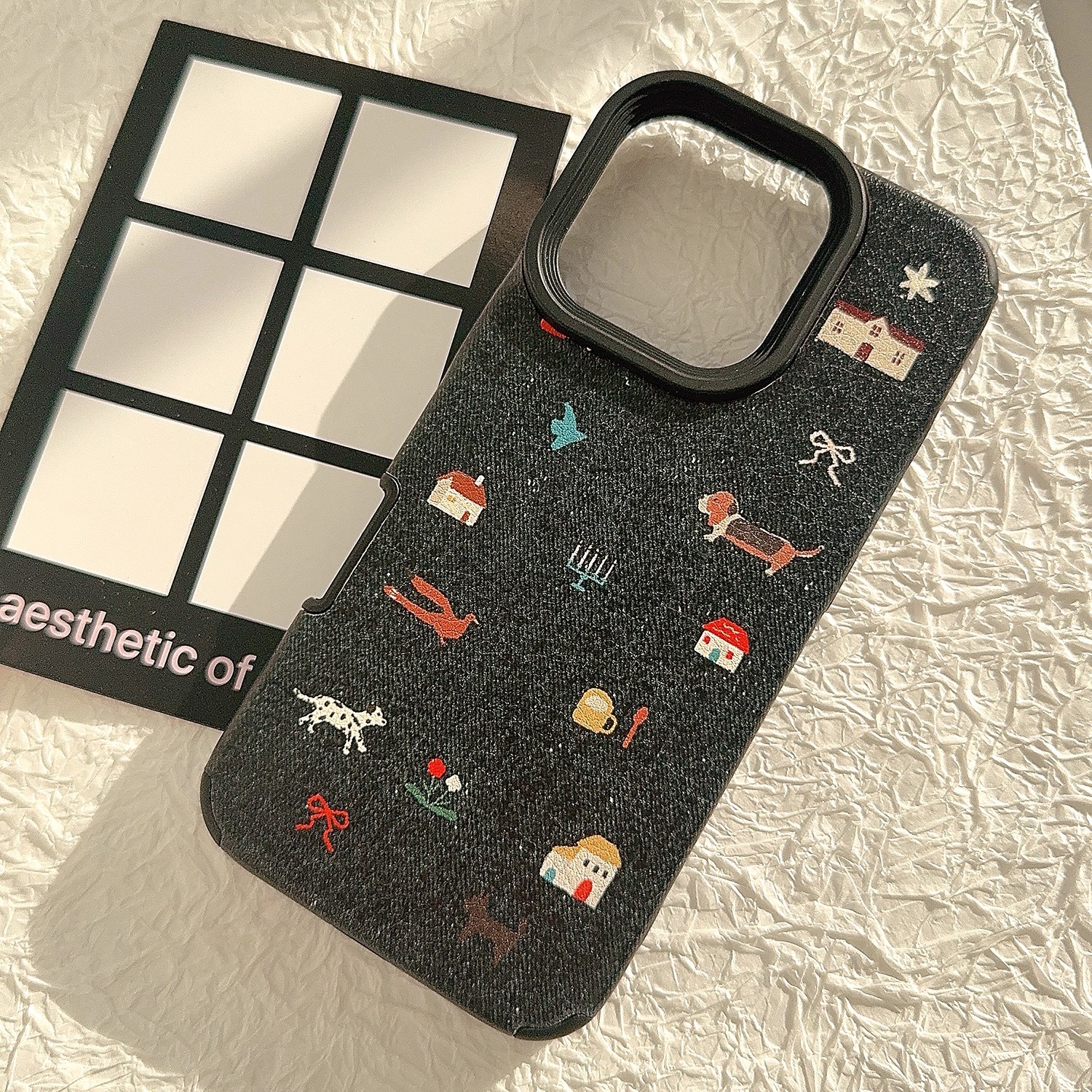 マットブラックベースに、犬・リボン・家・花・カトラリー・フォークなど、ミニマルながらユーモラスなモチーフが並ぶ、刺繍風プリントのソフトiPhoneケース。