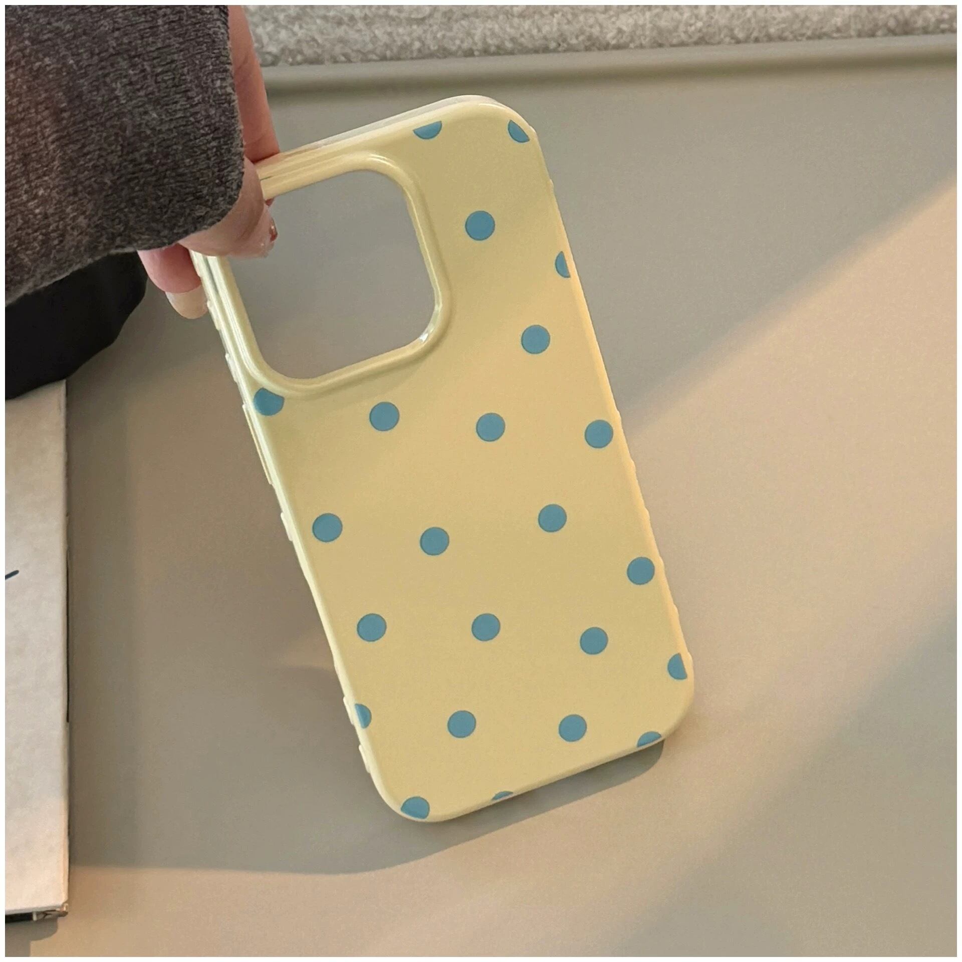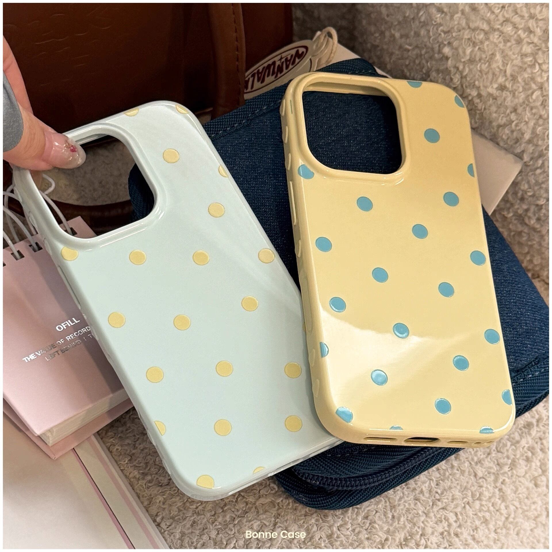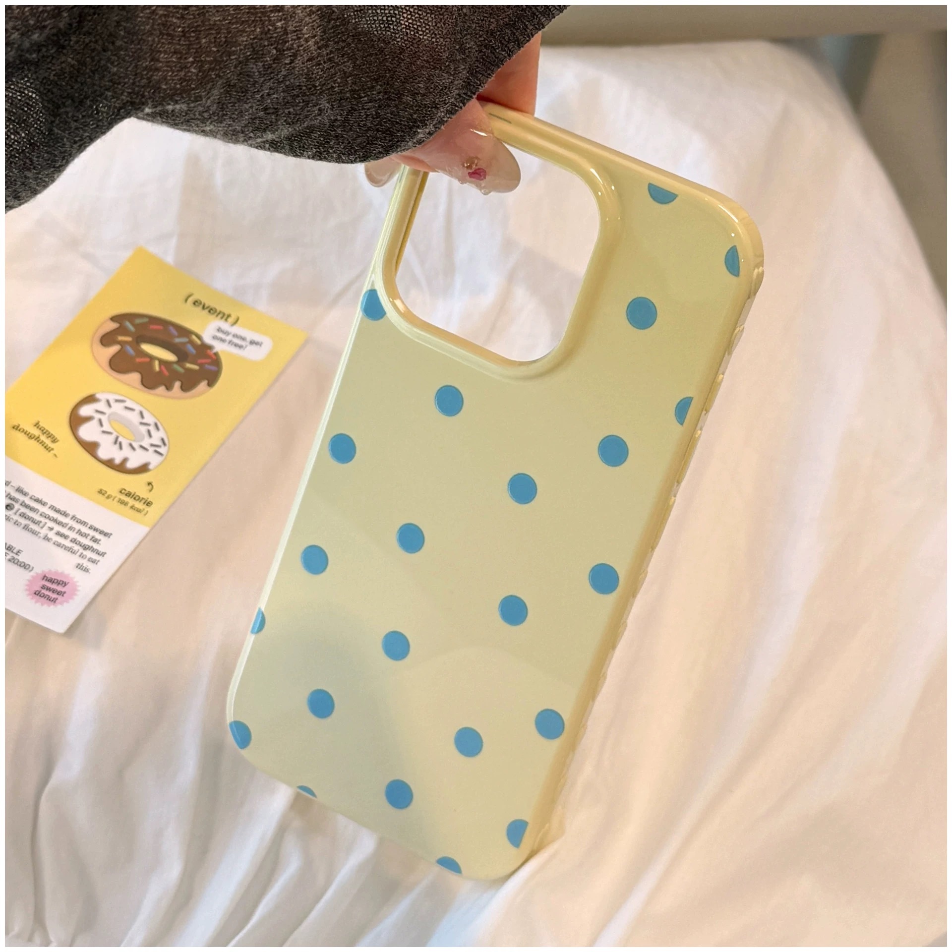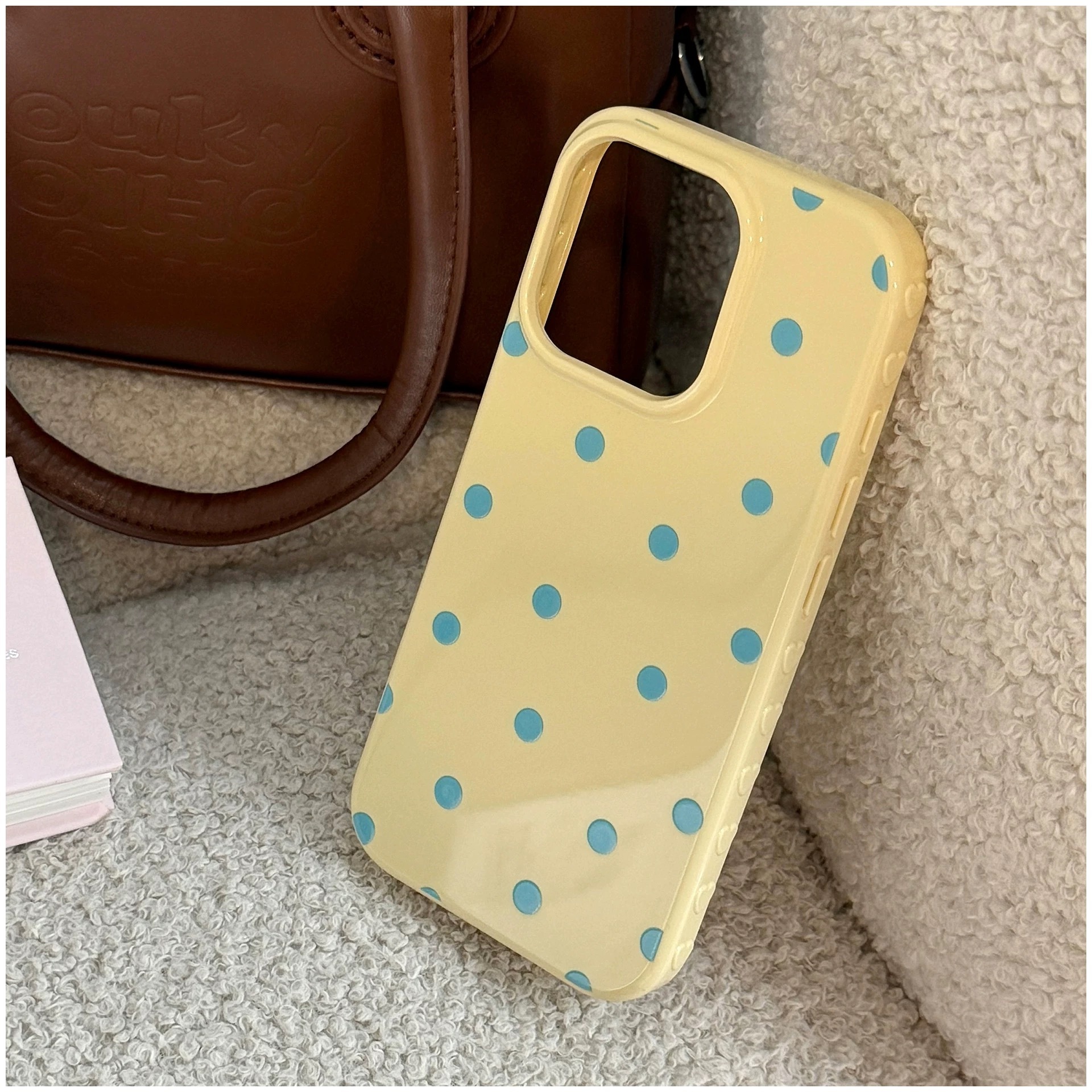明るくポップな雰囲気が魅力の、柠檬黄色ベースに爽やかな水色のドットが並んだiPhoneケースです。