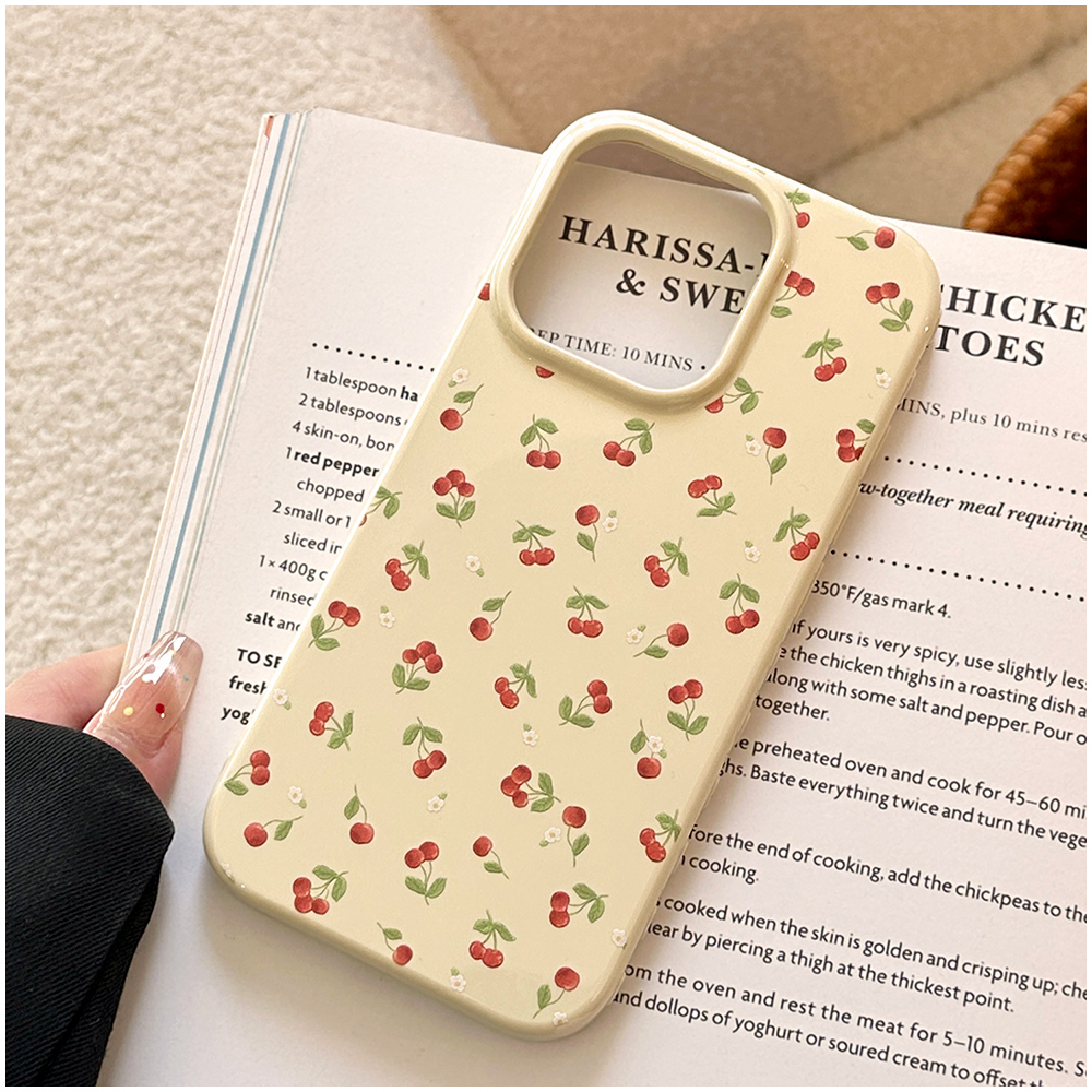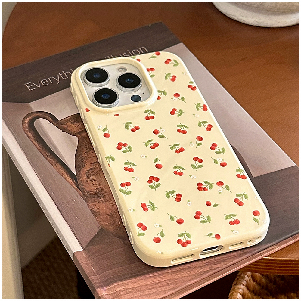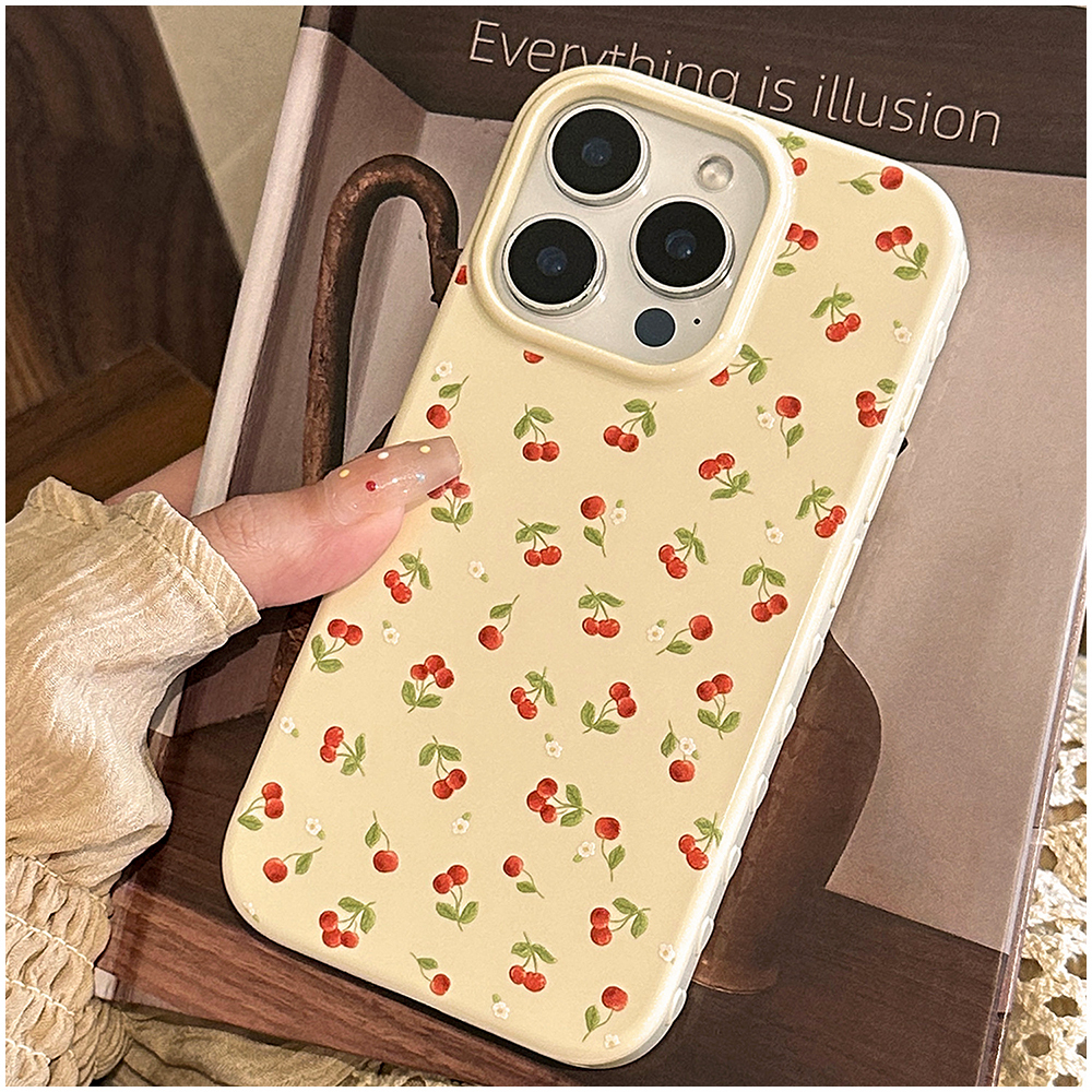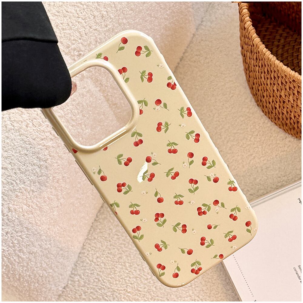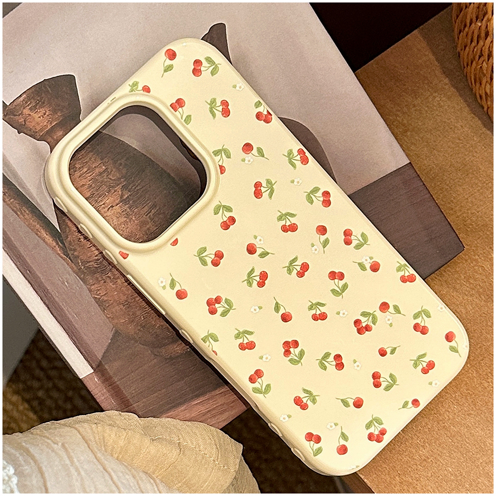 やわらかなクリームイエローのベースに、真っ赤なさくらんぼと小さな白い花が散りばめられた、ナチュラルで可愛いiPhoneケースです。