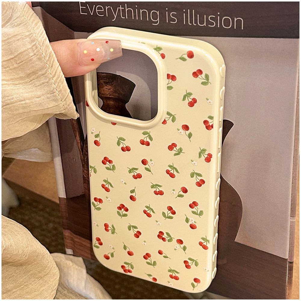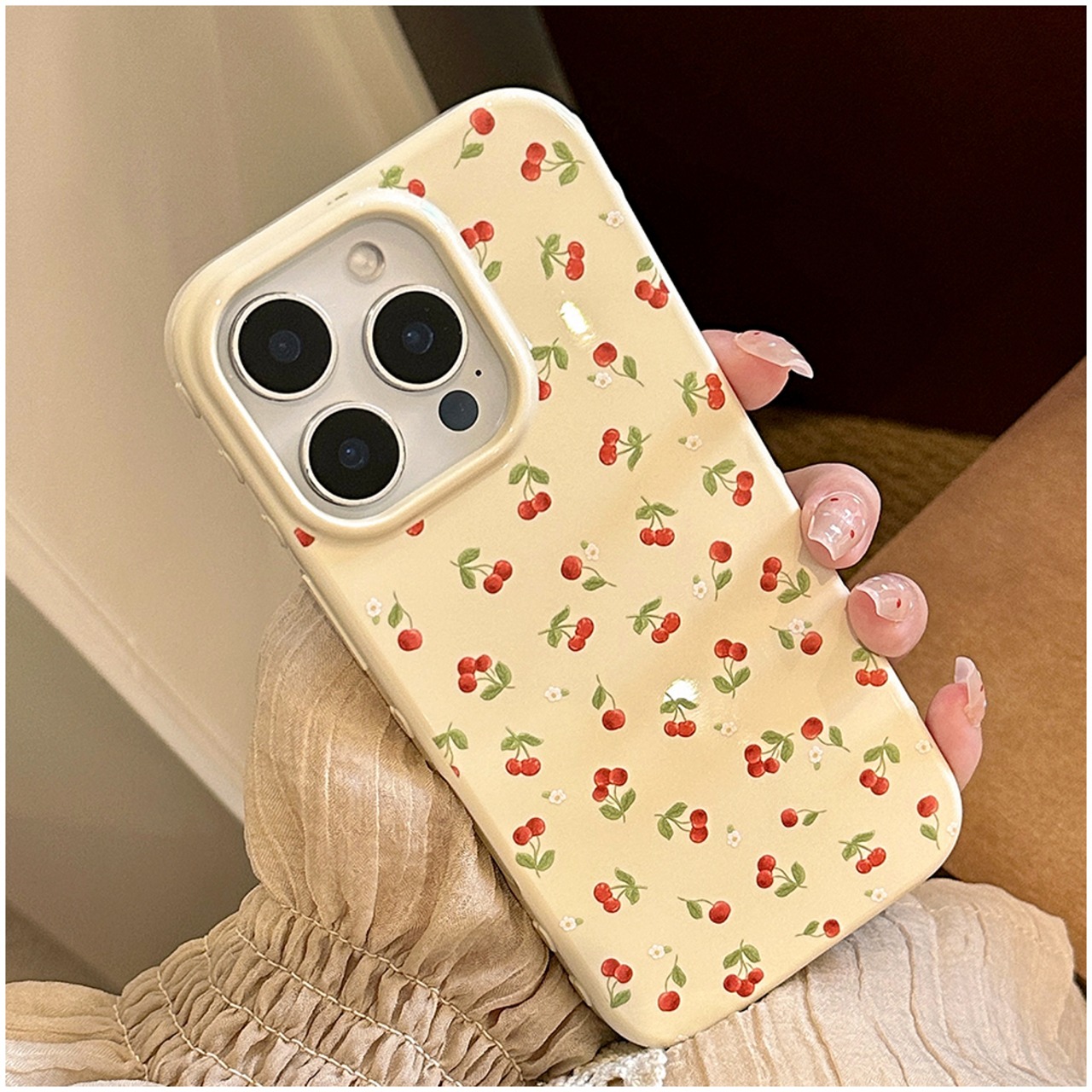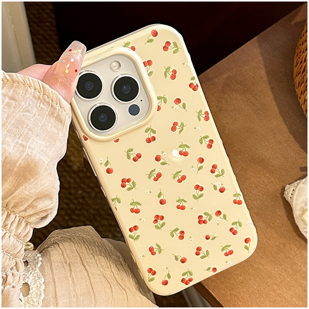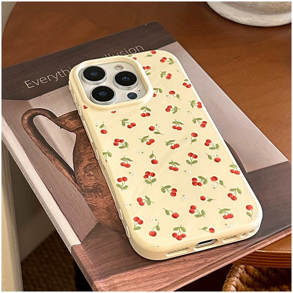 やわらかなクリームイエローのベースに、真っ赤なさくらんぼと小さな白い花が散りばめられた、ナチュラルで可愛いiPhoneケースです。