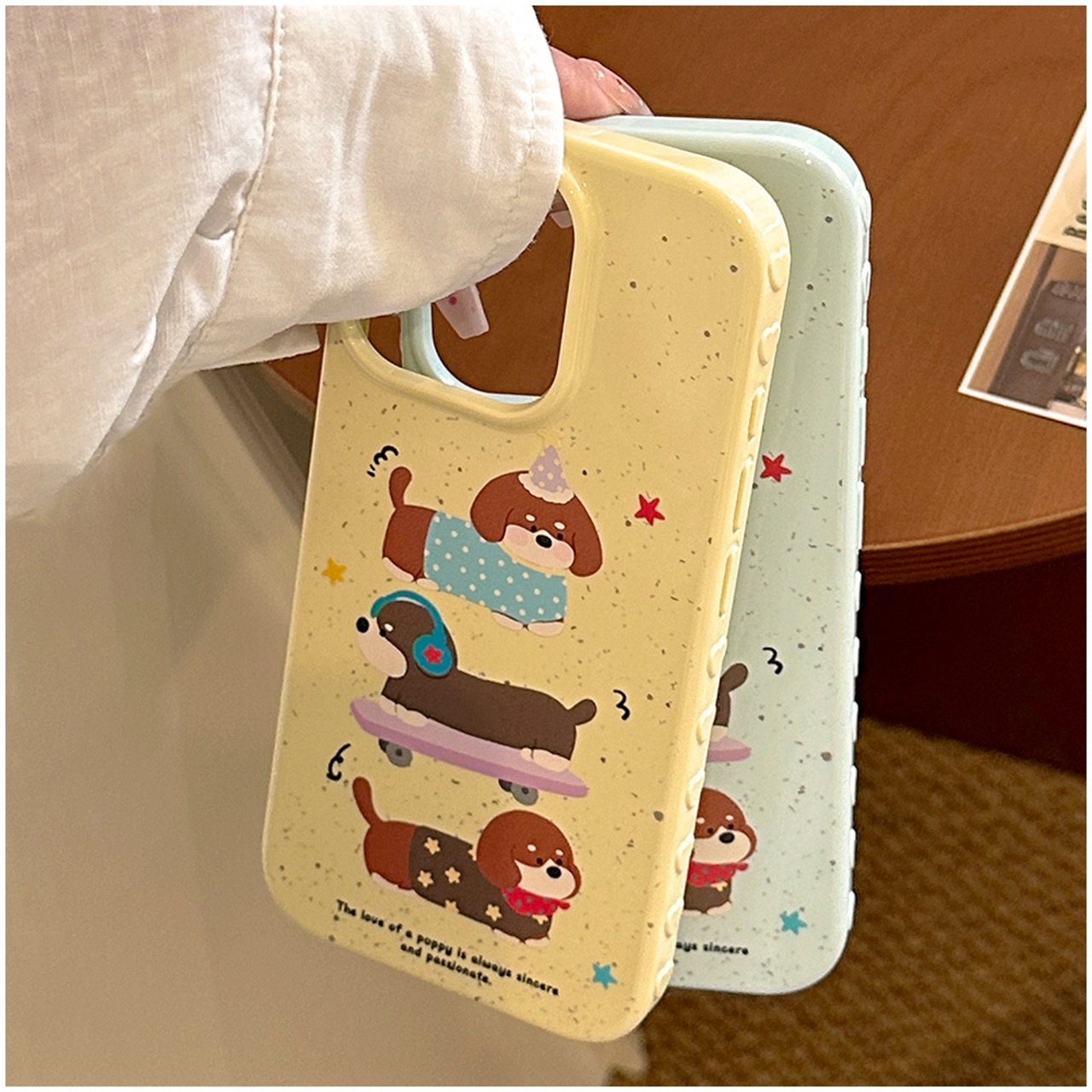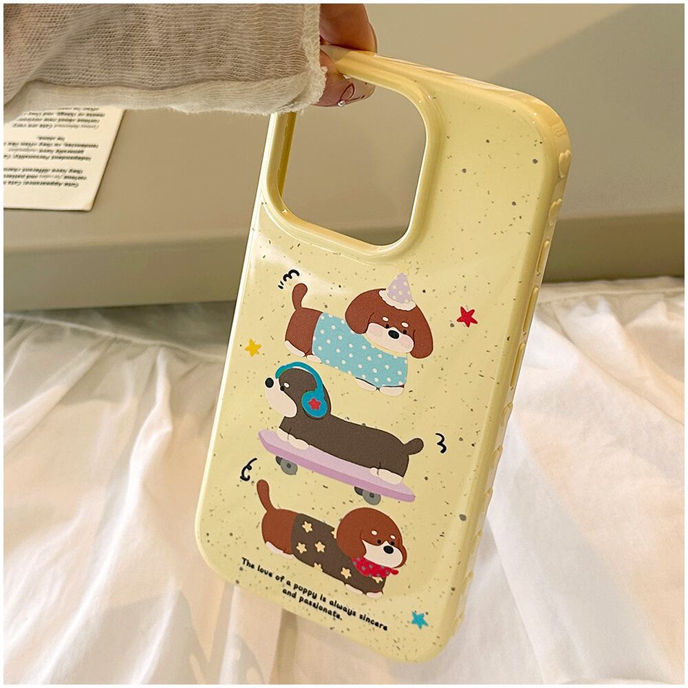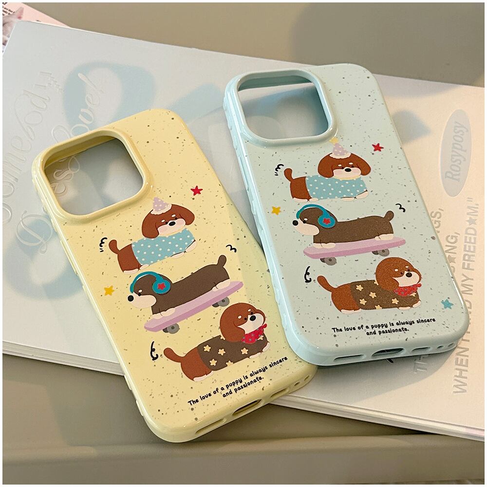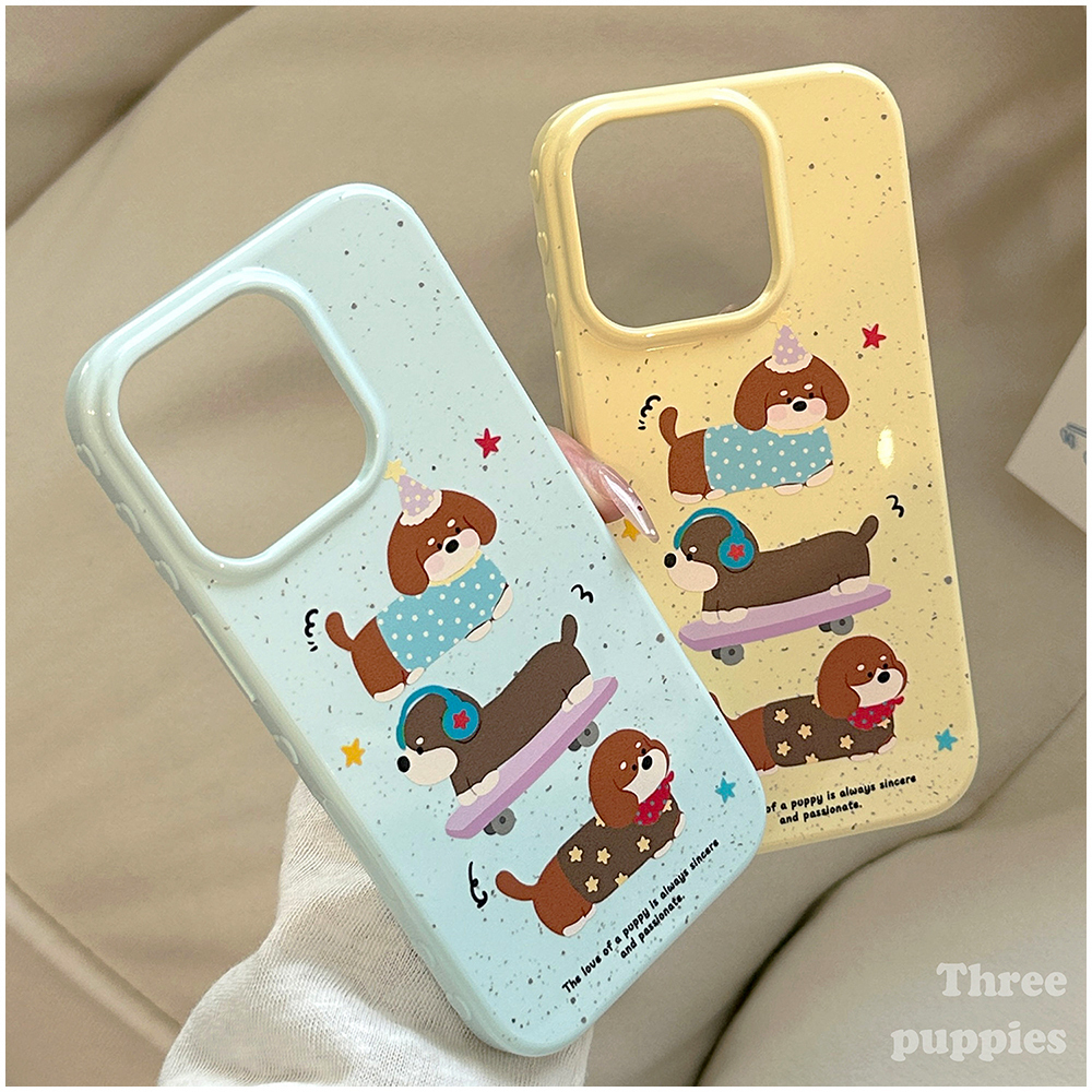 やさしいクリームイエローベースに、3匹の可愛らしい子犬たちがスケートボードに乗ったり、おしゃれな洋服を着て登場する、癒し系iPhoneケースです。