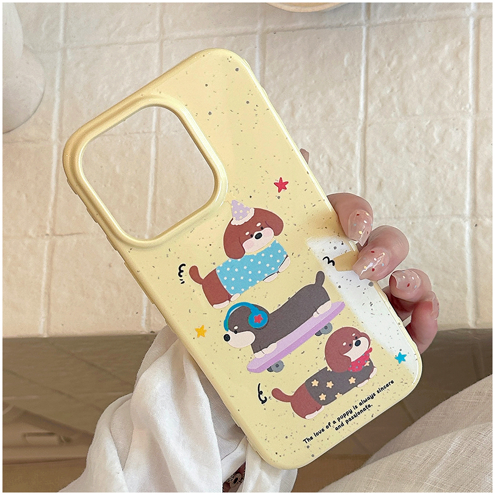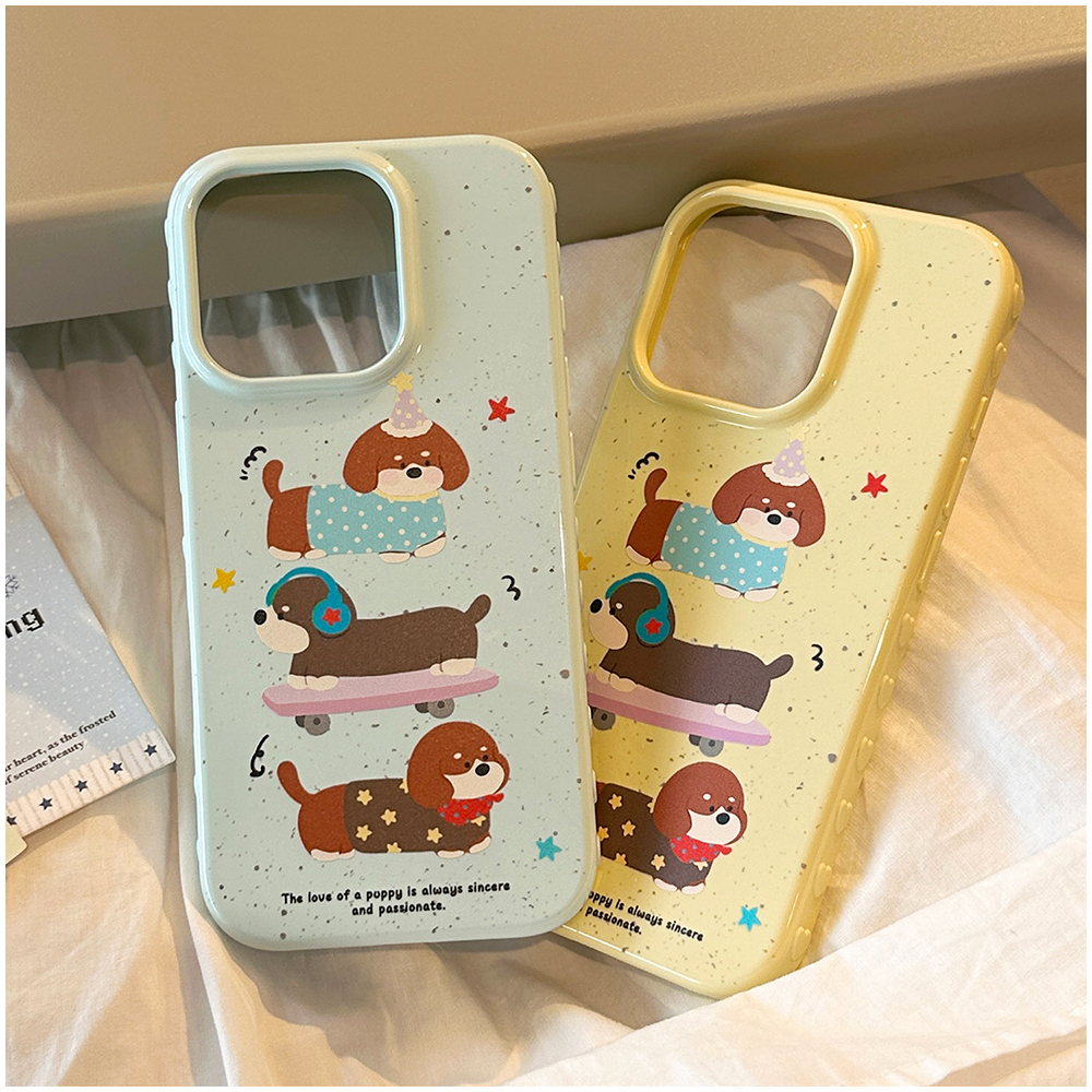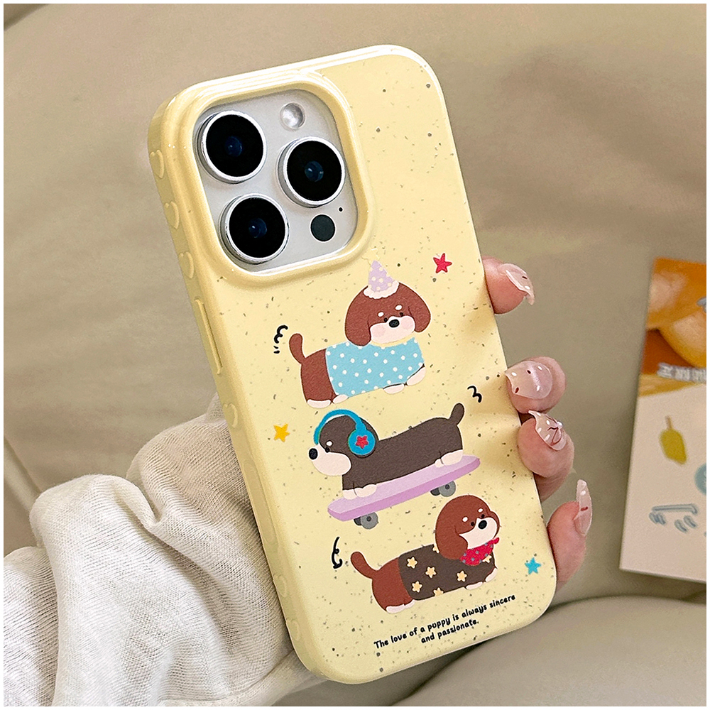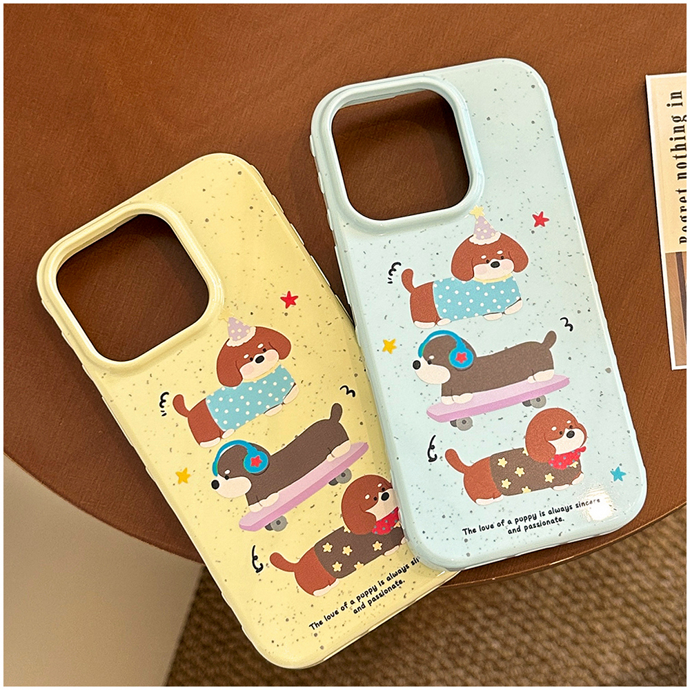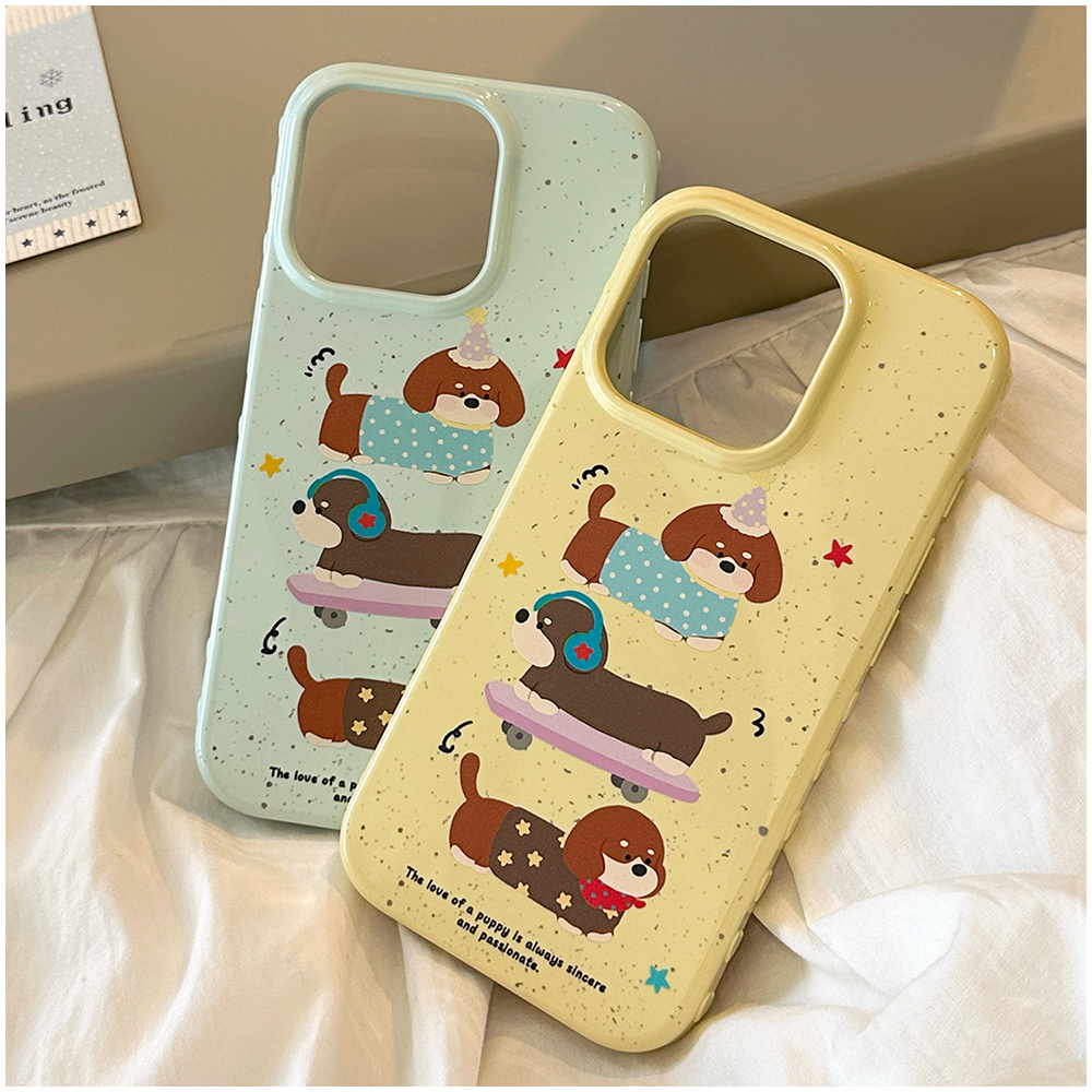 やさしいクリームイエローベースに、3匹の可愛らしい子犬たちがスケートボードに乗ったり、おしゃれな洋服を着て登場する、癒し系iPhoneケースです。