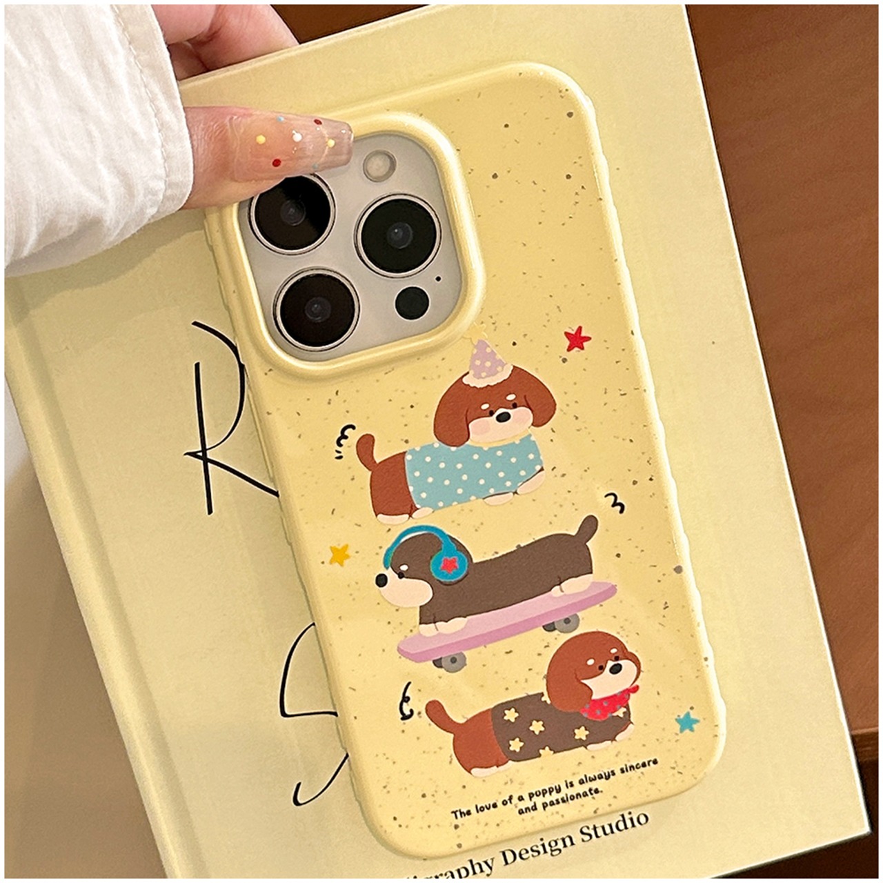 iPhoneケース 犬柄スケボー&パーティーコーデイラスト ソフトシリコンカバー クリームイエロー かわいい韓国風スマホケース iPhone17/16/15/14/13/12対応 | Oct.life_STYLE