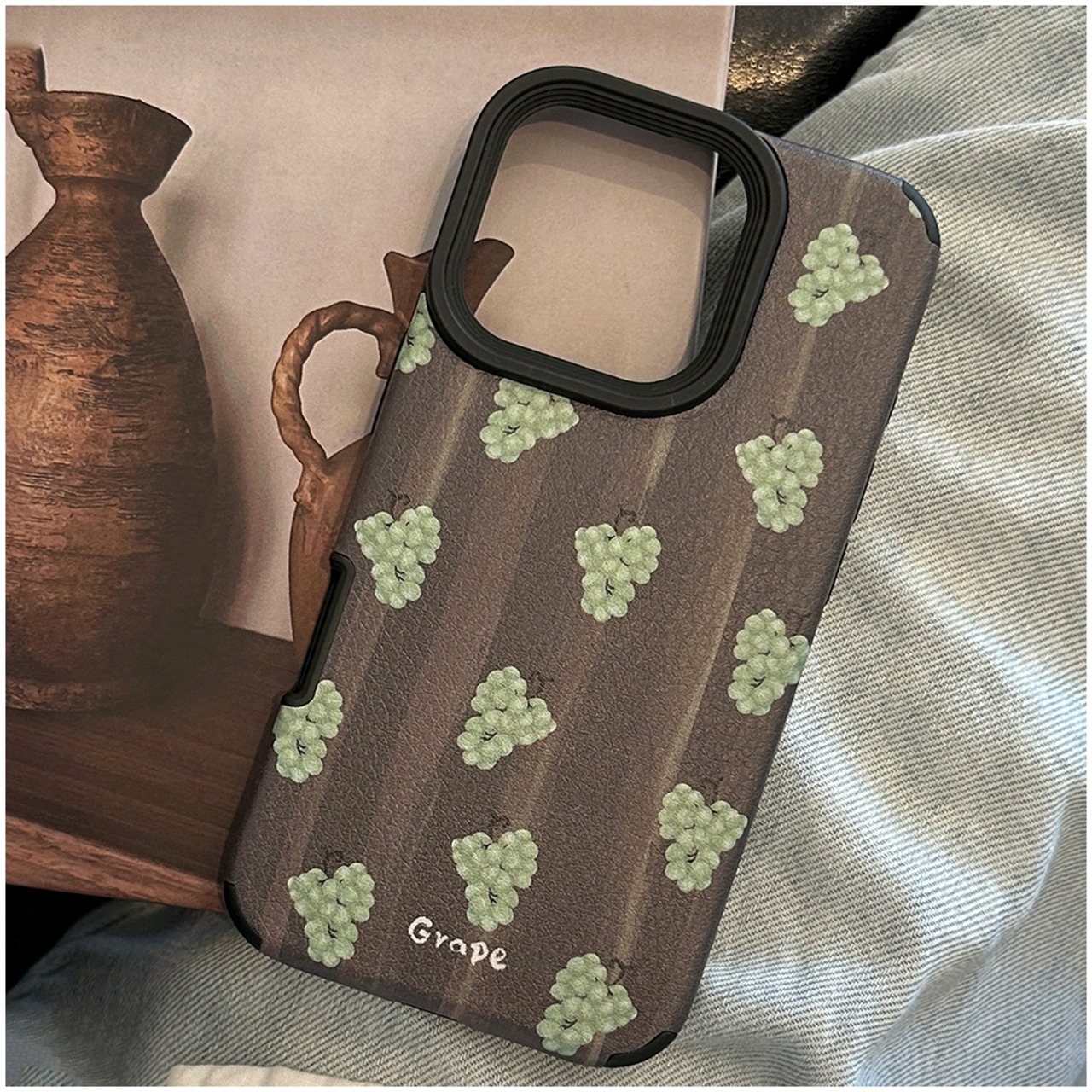 深いブラウン系ベースに、リアルな質感の葡萄プリントが規則的に配置されており、大人の可愛さと遊び心を兼ね備えたデザインです。