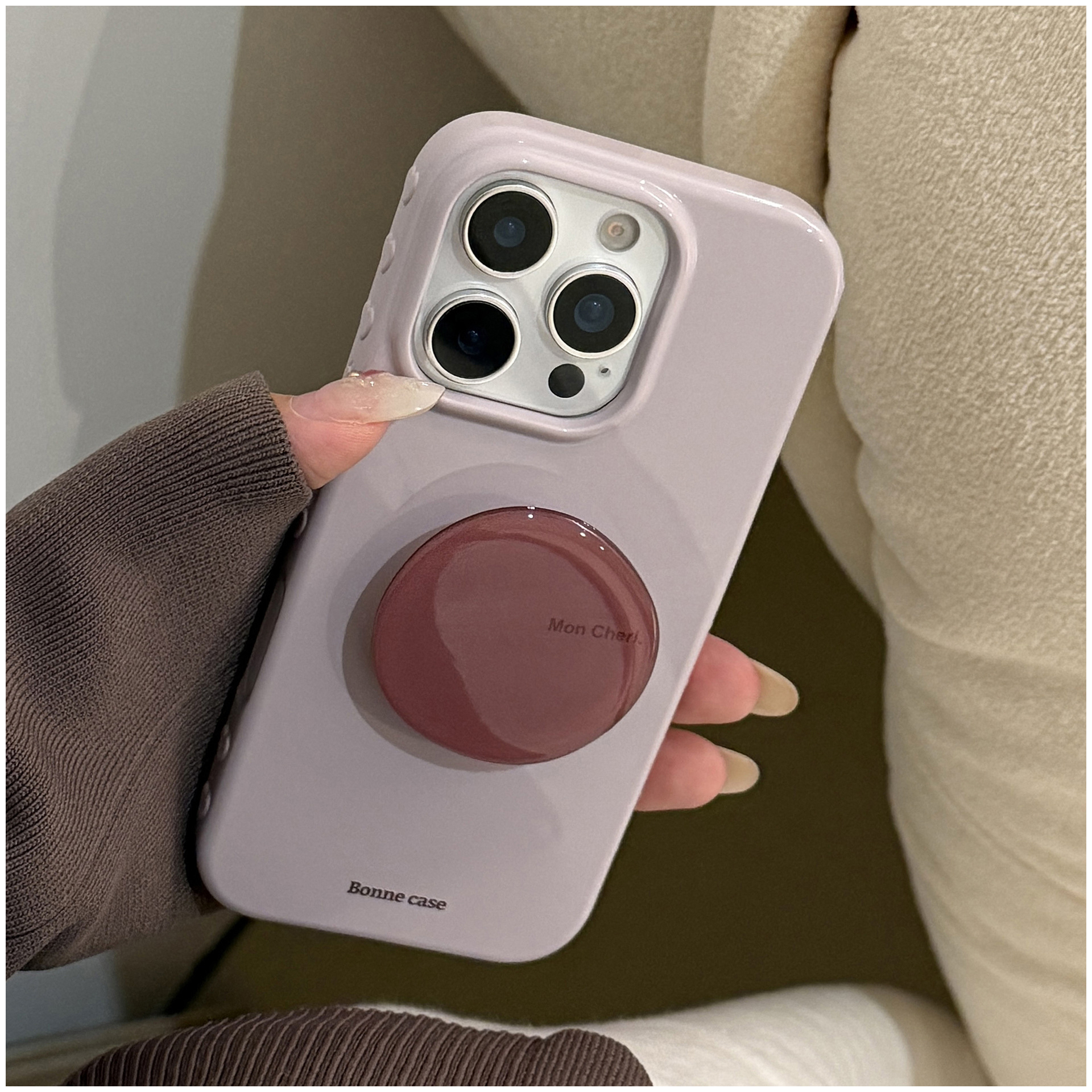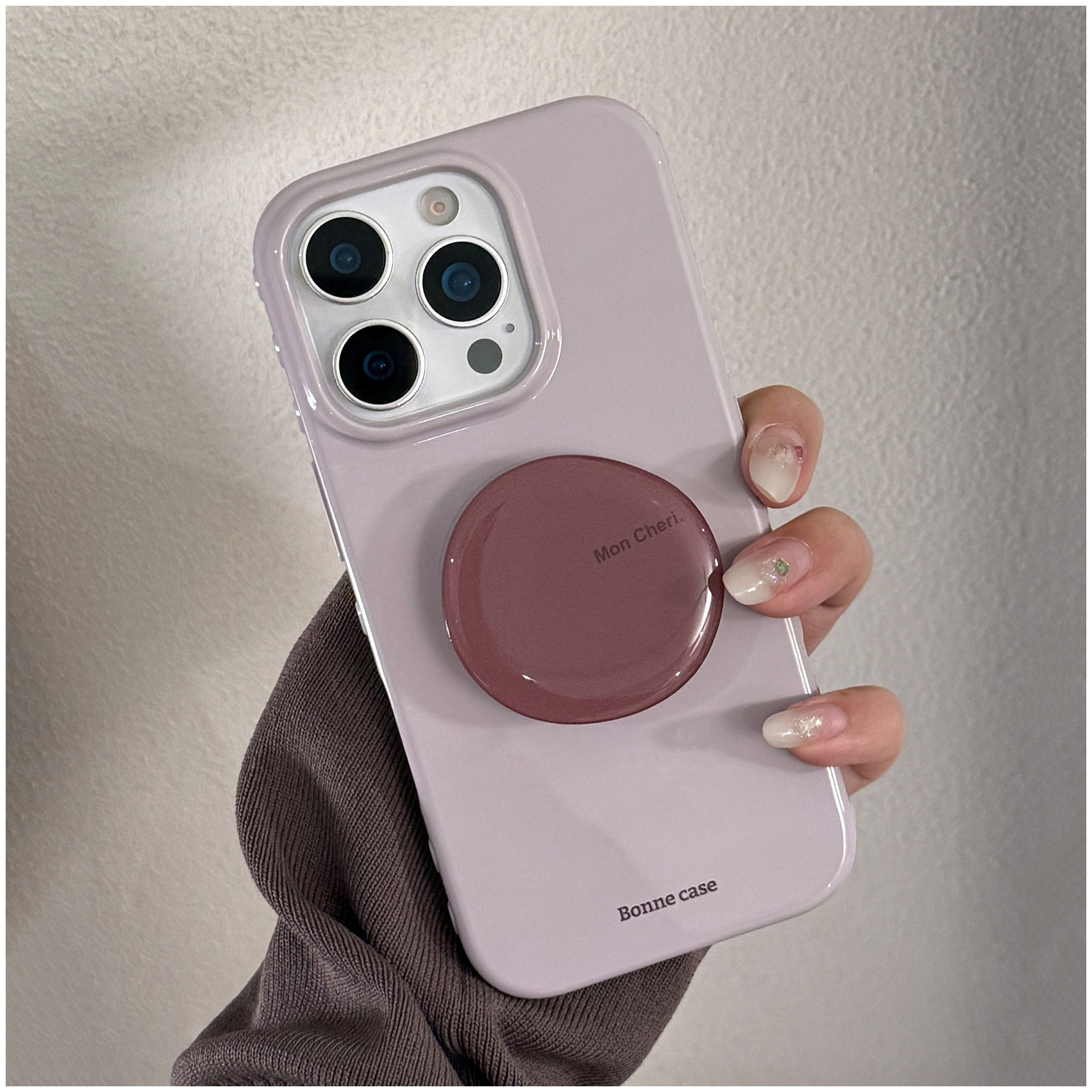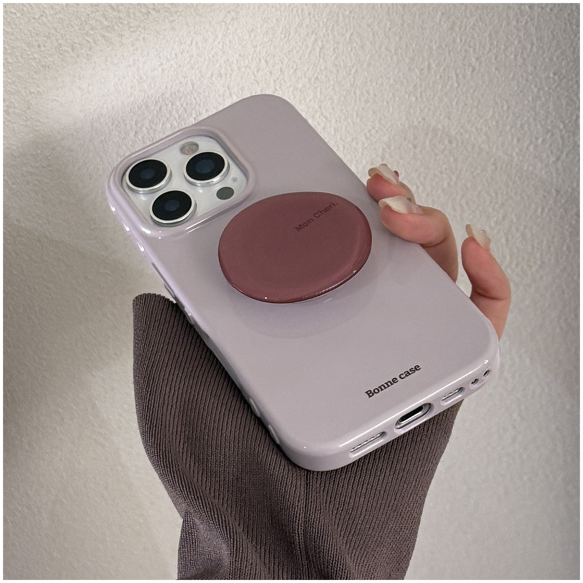 韓国風のくすみ系ライトグレージュに、艶感のあるワンカラー。シンプルながらも高級感のあるデザインで、シーンを選ばず使いやすいiPhoneケースです。
