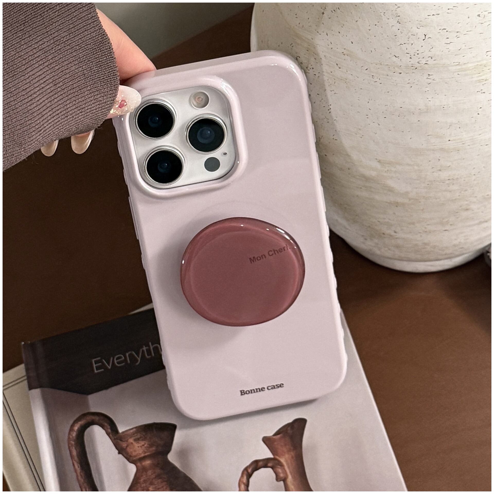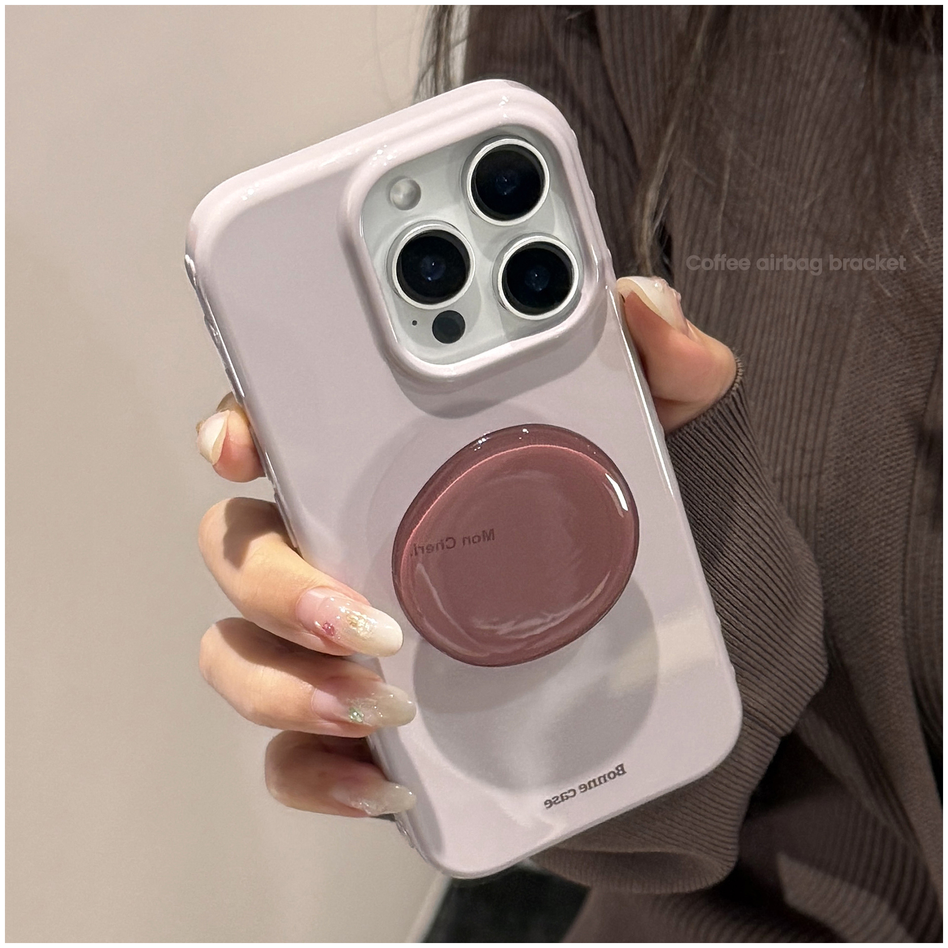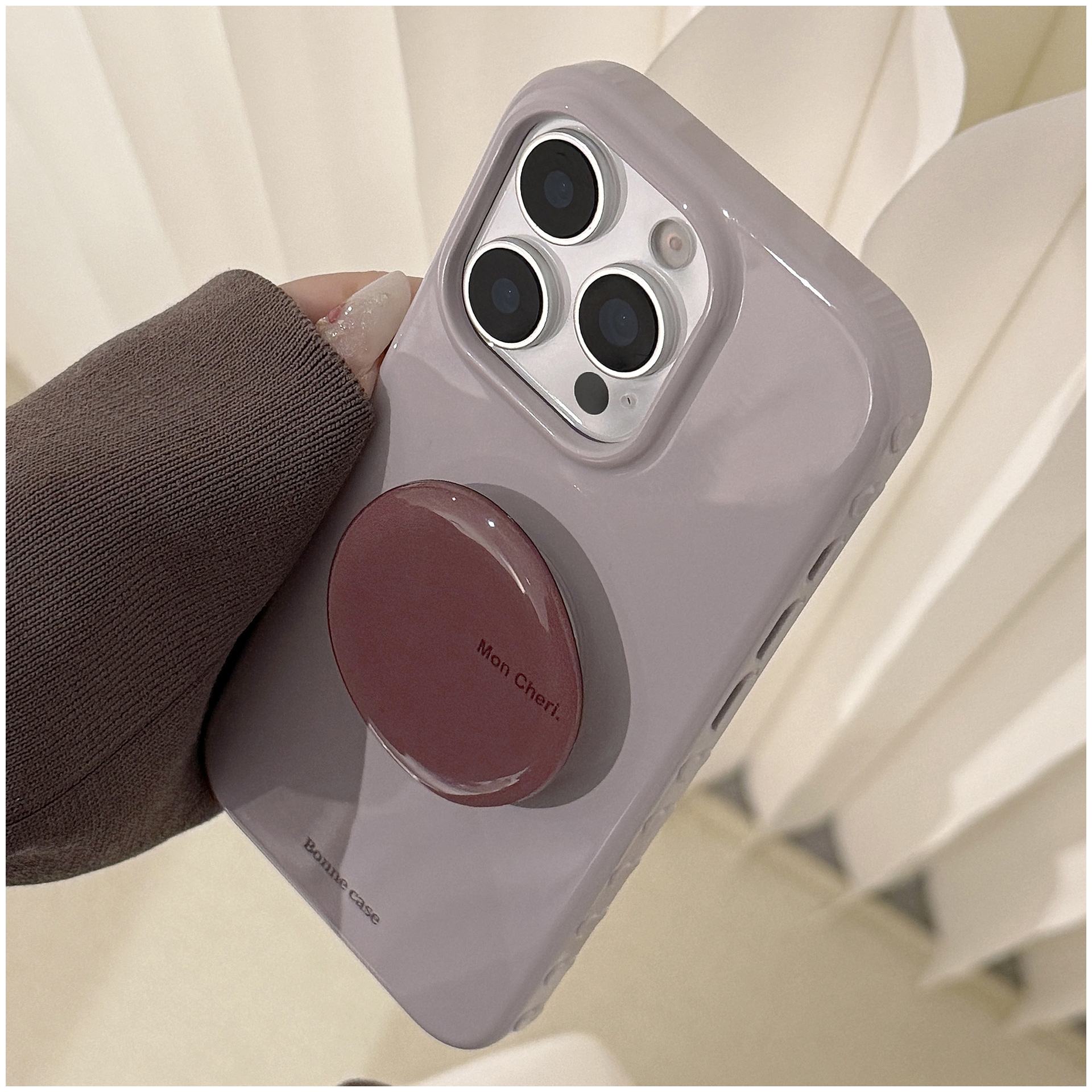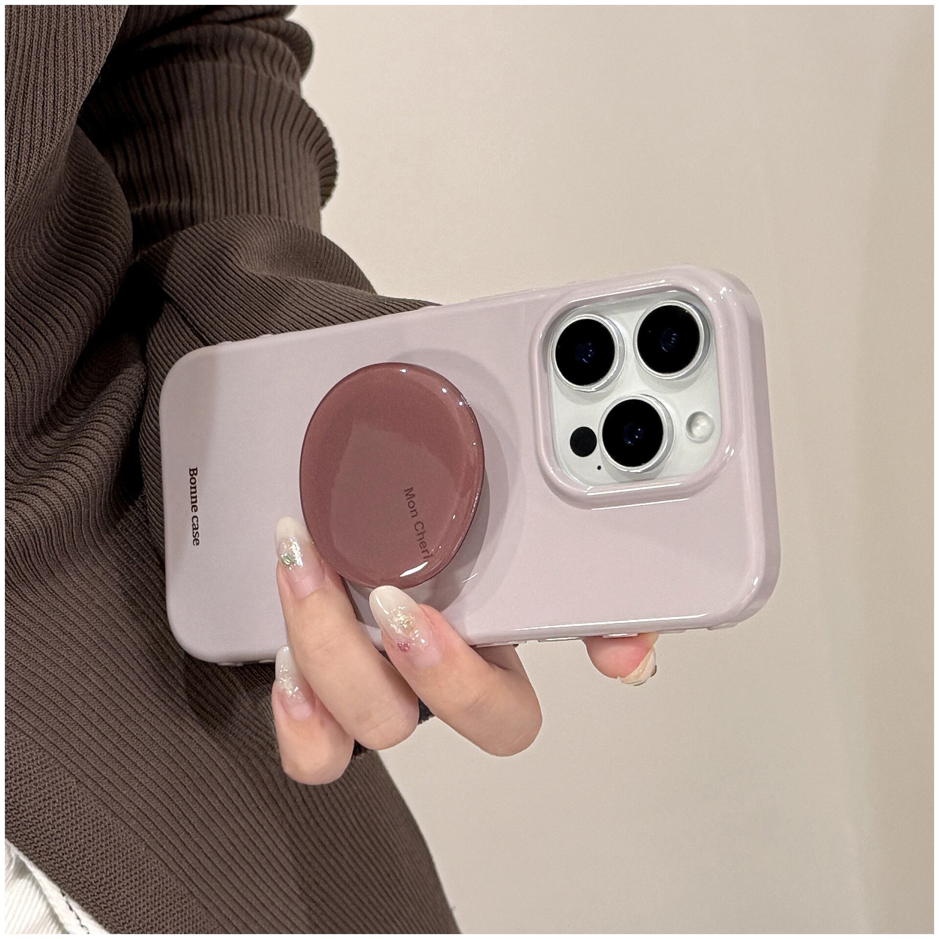 韓国風のくすみ系ライトグレージュに、艶感のあるワンカラー。シンプルながらも高級感のあるデザインで、シーンを選ばず使いやすいiPhoneケースです。