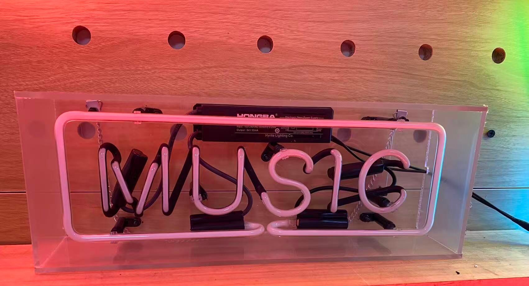 ・デザイン:音楽をテーマにした「MUSIC」ロゴを、白色発光の文字と赤いフレームで仕上げたスタイリッシュなガラスネオンサイン。視認性が高く、空間を一瞬で印象的に演出します。