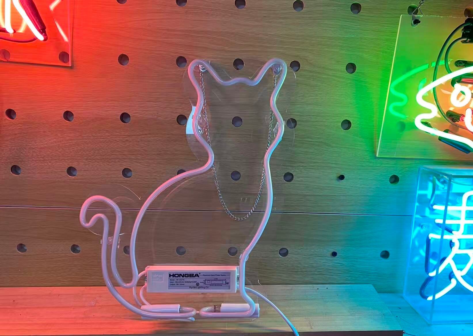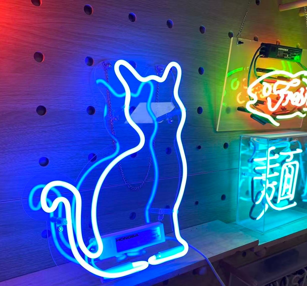 ・デザイン:可愛らしい猫のシルエットをモチーフにしたブルー発光のネオンサイン。シンプルながらも存在感があり、夜間のインテリアや店舗装飾として空間をやさしく照らします。